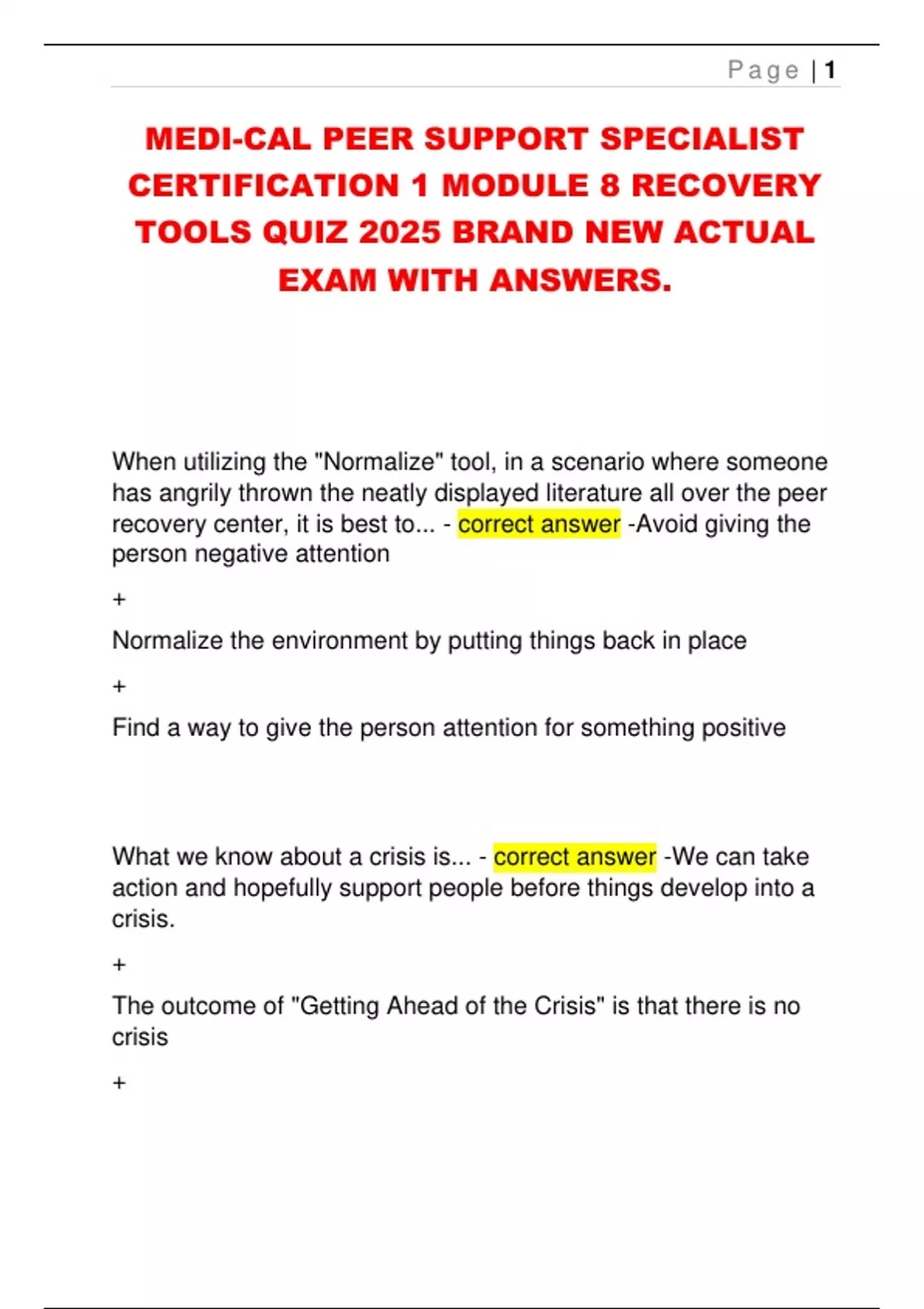 MEDI-CAL PEER SUPPORT SPECIALIST CERTIFICATION 1 MODULE 8 RECOVERY TOOLS QUIZ 2025 BRAND NEW ACTUAL EXAM WITH ANSWERS.