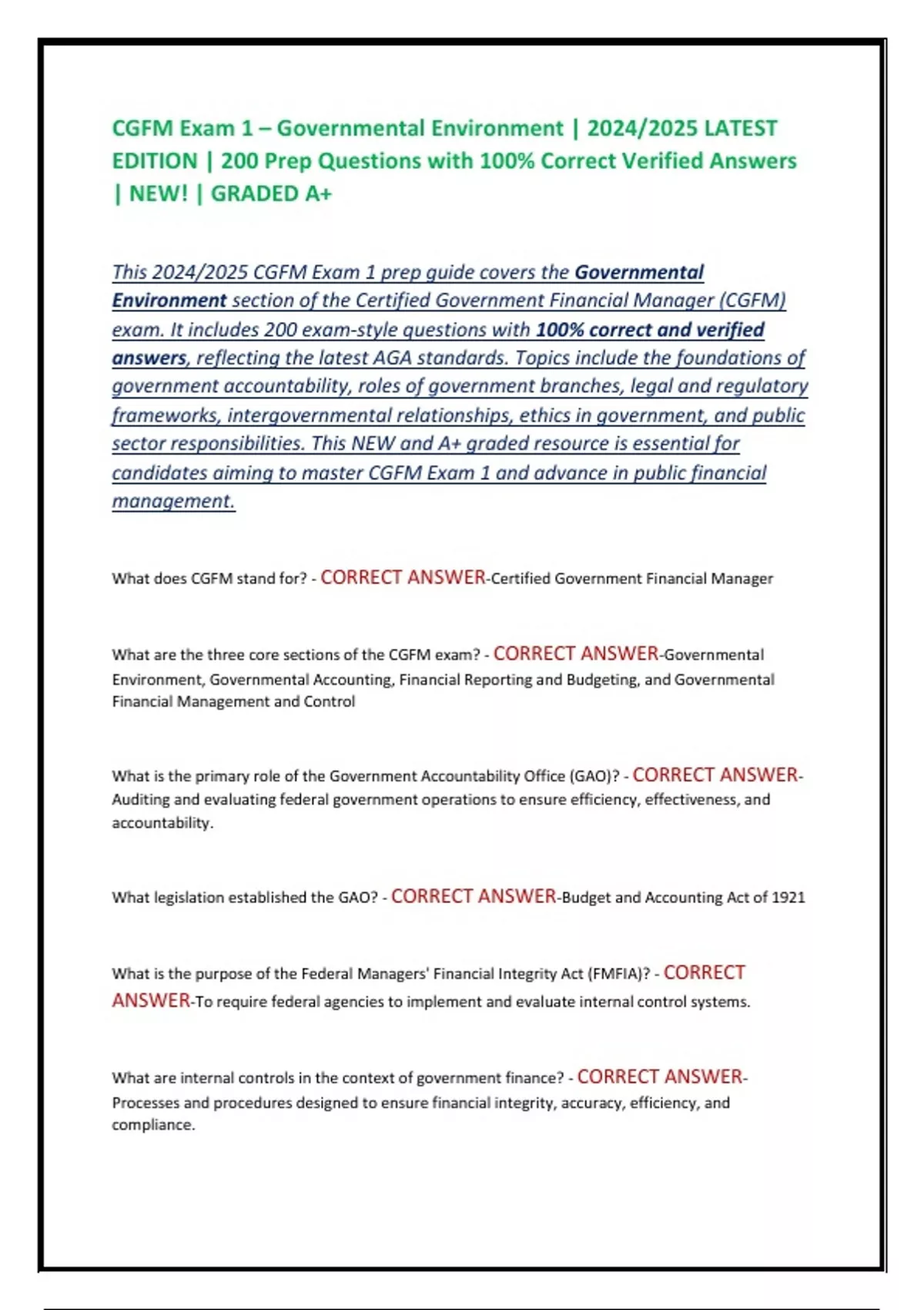 This 2024/2025 CGFM Exam 1 prep guide covers the Governmental Environment section of the Certified Government Financial Manager (CGFM) exam. It includes 200 exam-style questions with 100% correct and verified answers, reflecting the latest AGA standards. Topics include the foundations of government accountability, roles of government branches, legal and regulatory frameworks, intergovernmental relationships, ethics in government, and public sector responsibilities. This NEW and A+ graded resource is essential for candidates aiming to master CGFM Exam 1 and advance in public financial management.