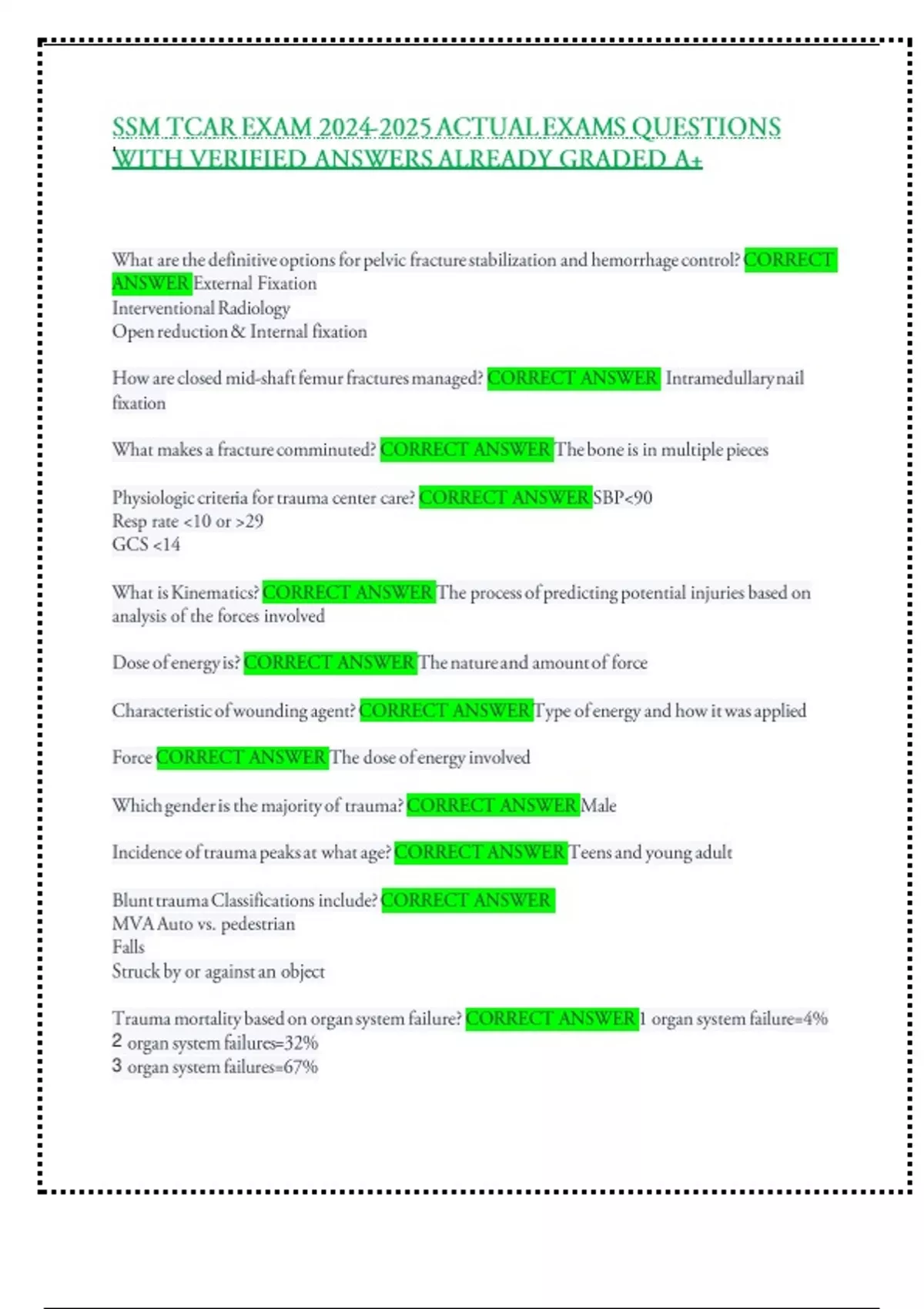 SSM TCAR EXAM ACTUAL EXAMS QUESTIONS WITH VERIFIED ANSWERS