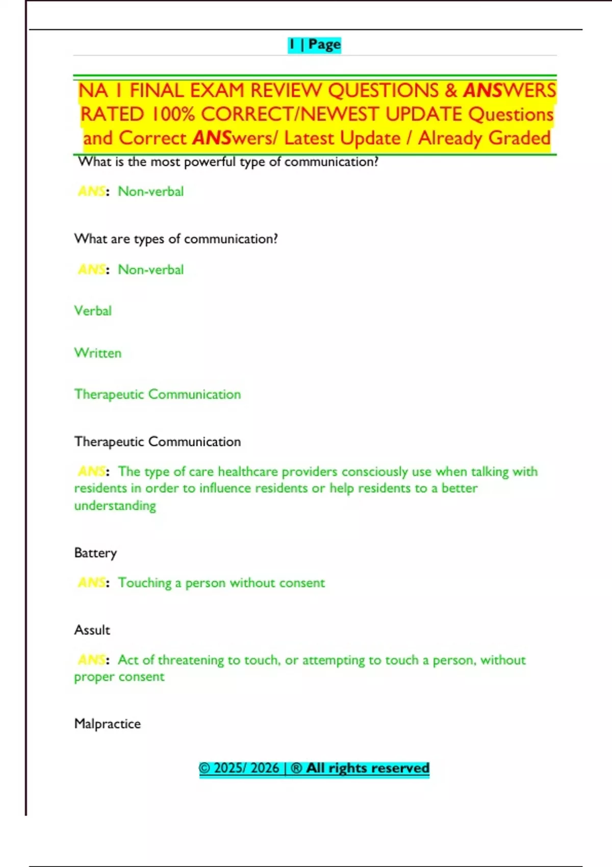 NA 1 FINAL EXAM REVIEW QUESTIONS & ANSWERS