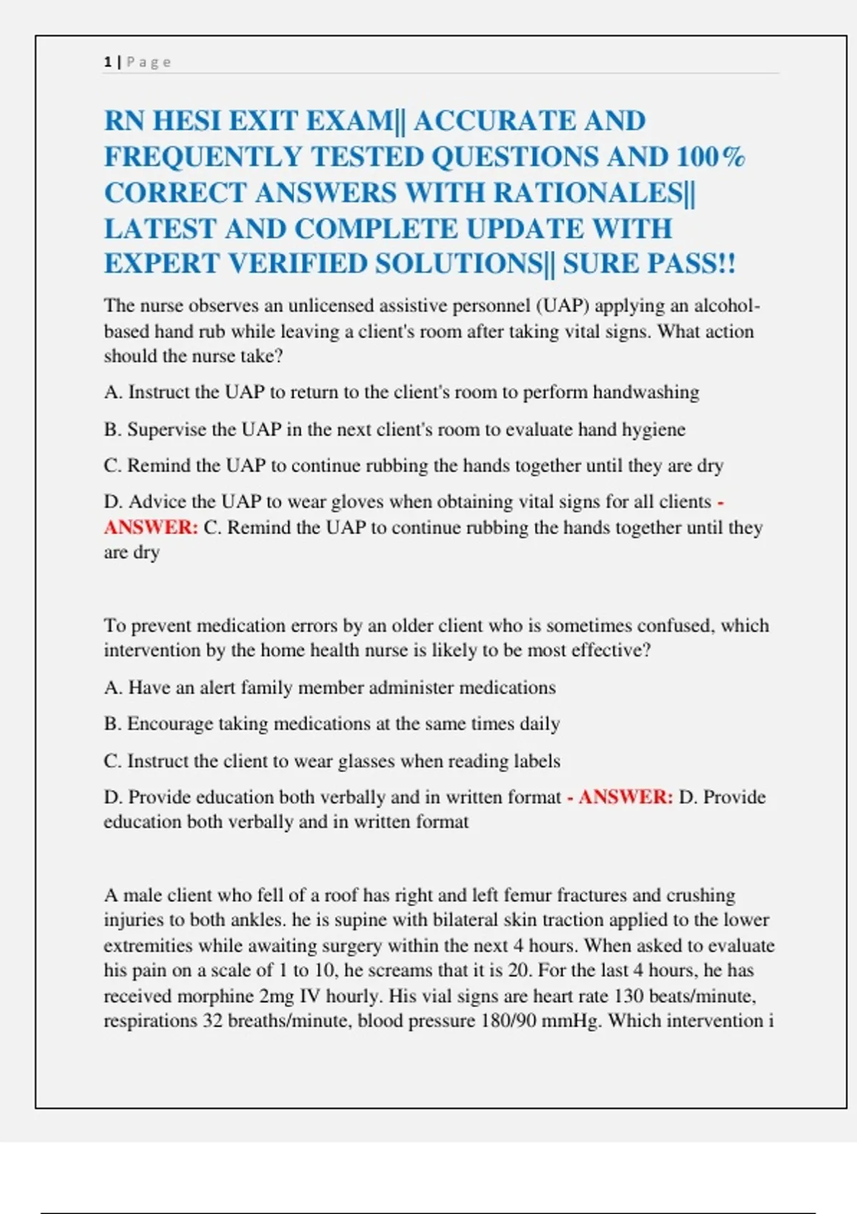 RN HESI EXIT EXAM|| ACCURATE AND FREQUENTLY TESTED QUESTIONS AND 100% CORRECT ANSWERS WITH RATIONALES|| LATEST AND COMPLETE UPDATE WITH EXPERT VERIFIED SOLUTIONS|| SURE PASS!!