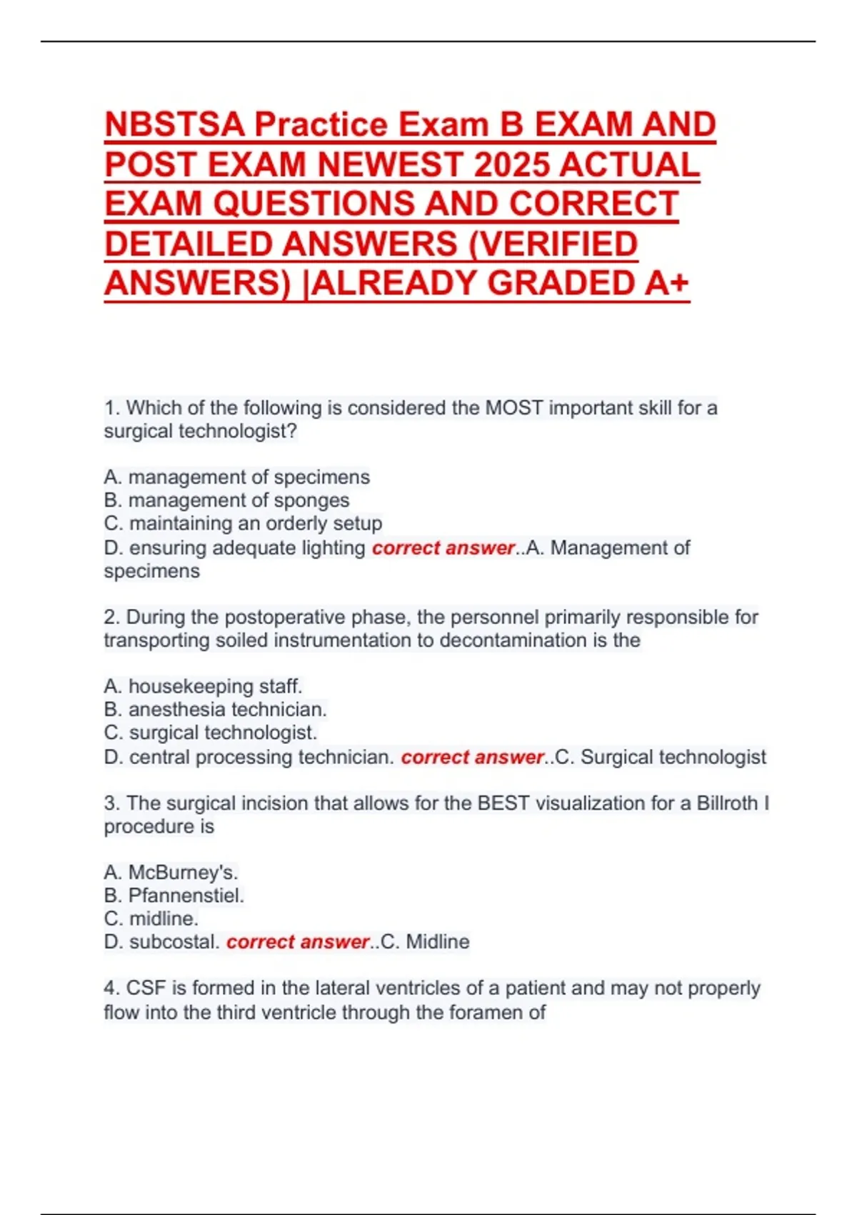 NBSTSA Practice Exam B EXAM AND POST EXAM NEWEST 2025 ACTUAL EXAM QUESTIONS AND CORRECT DETAILED ANSWERS (VERIFIED ANSWERS) |ALREADY GRADED A+ 1. Which of the following is considered the MOST important skill for a surgical technologist?