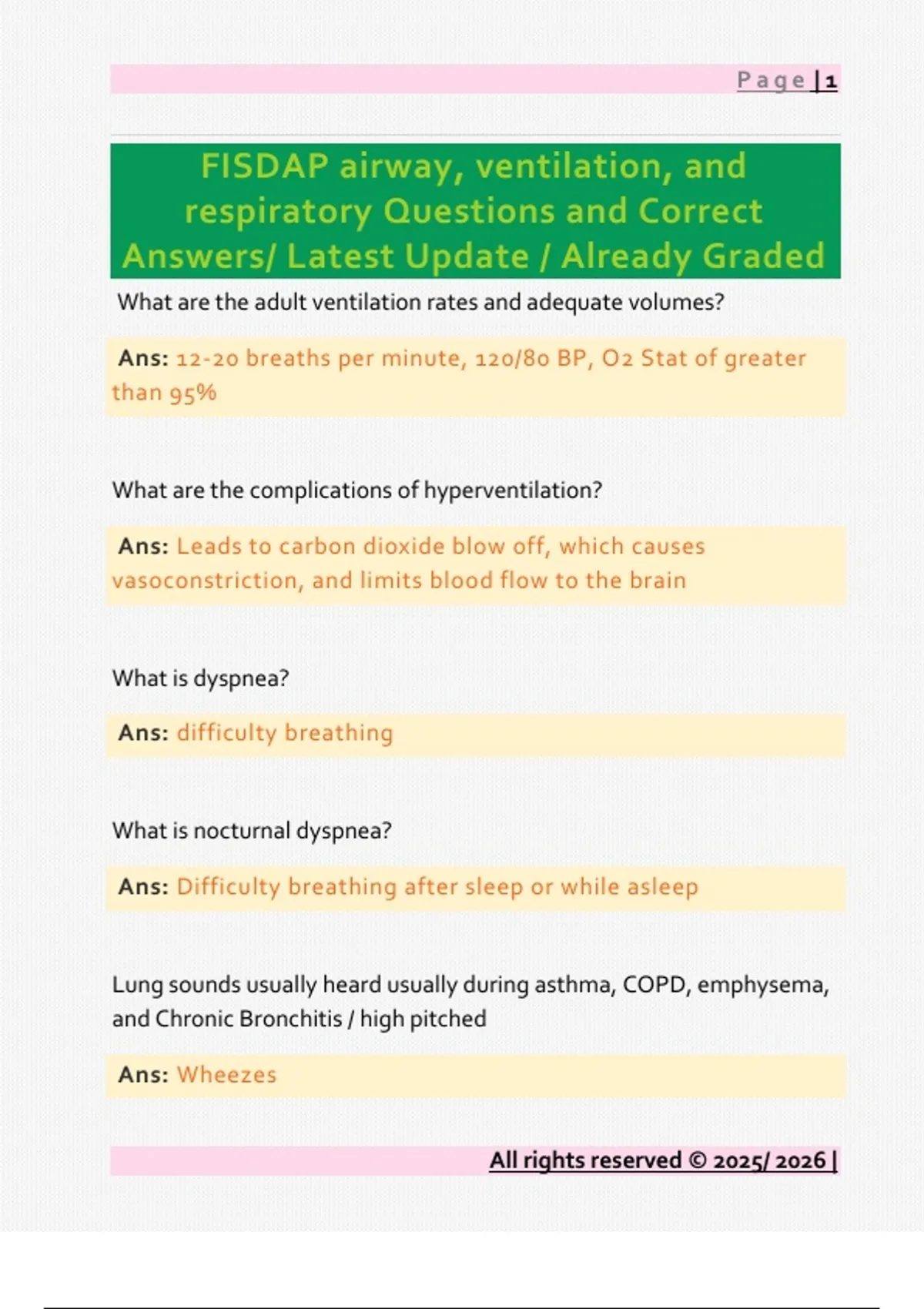 FISDAP airway, ventilation, and respiratory Questions and Correct Answers/ Latest Update / Already Graded