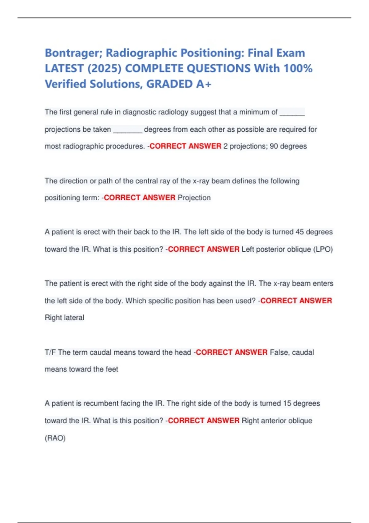 Bontrager; Radiographic Positioning: Final Exam