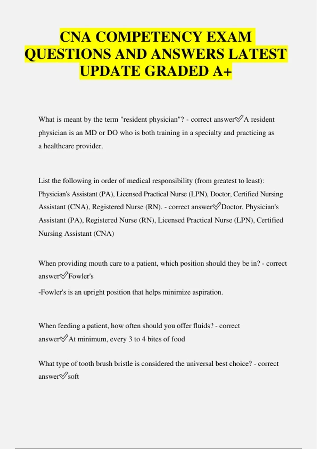 Pass your Certified Nursing Assistant (CNA) Competency Exam with confidence using verified questions and answers! This high-yield guide includes 150+ exam-style questions with detailed explanations, covering skills evaluation and written test content for state certification. What’s Included? 1. Written Exam Prep (100+ Q&A) Patient Care Basics Infection control (handwashing, PPE) Vital signs (normal ranges, abnormalities) ADLs (bathing, dressing, toileting) Safety & Ethics Fall prevention, restraint guidelines HIPAA, patient rights, abuse reporting Medical Knowledge Common conditions (diabetes, stroke, dementia) Emergency response (choking, CPR basics) 2. Skills Exam Guide (50+ Tasks) Step-by-Step Checklists for: Handwashing (WHO technique) Blood Pressure Measurement Ambulation with Gait Belt Perineal Care Bedmaking (Occupied/Unoccupied) Common Mistakes to Avoid Breaking sterile field Forgetting patient privacy 3. Test-Taking Strategies How to ace "select all that apply" questions Time management for timed skills stations Why Choose This Guide? State-Exam Aligned – Matches NNAAP or Prometric test plans Graded A+ – Used by CNAs who passed on first attempt Visual Aids – Includes illustrated skill steps Perfect For: CNA students prepping for state exams Career changers entering healthcare Skills refreshers before job interviews Master the exam and launch your healthcare career!