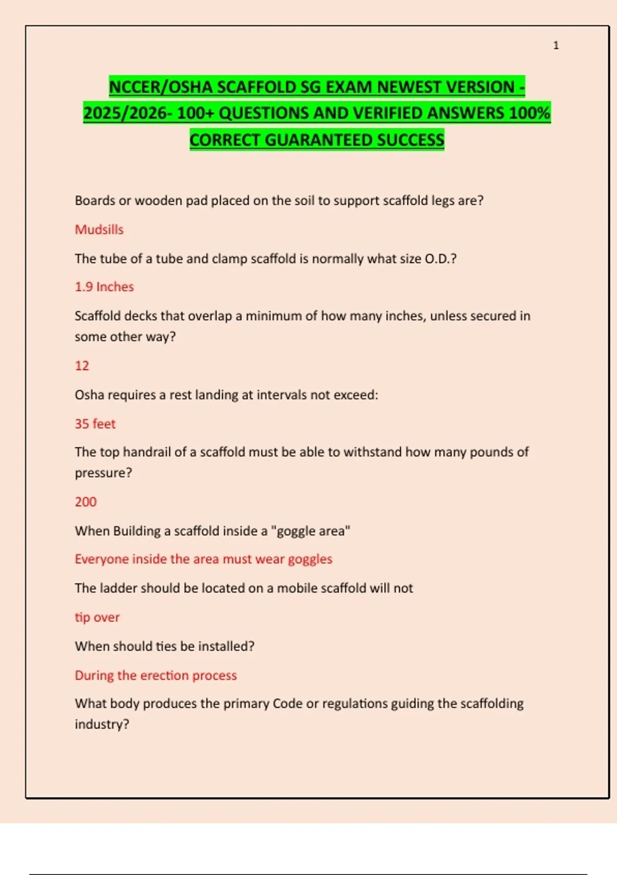 NCCER/OSHA SCAFFOLD SG EXAM NEWEST VERSION 2025/2026- 100+ QUESTIONS AND VERIFIED ANSWERS 100% CORRECT GUARANTEED SUCCESS