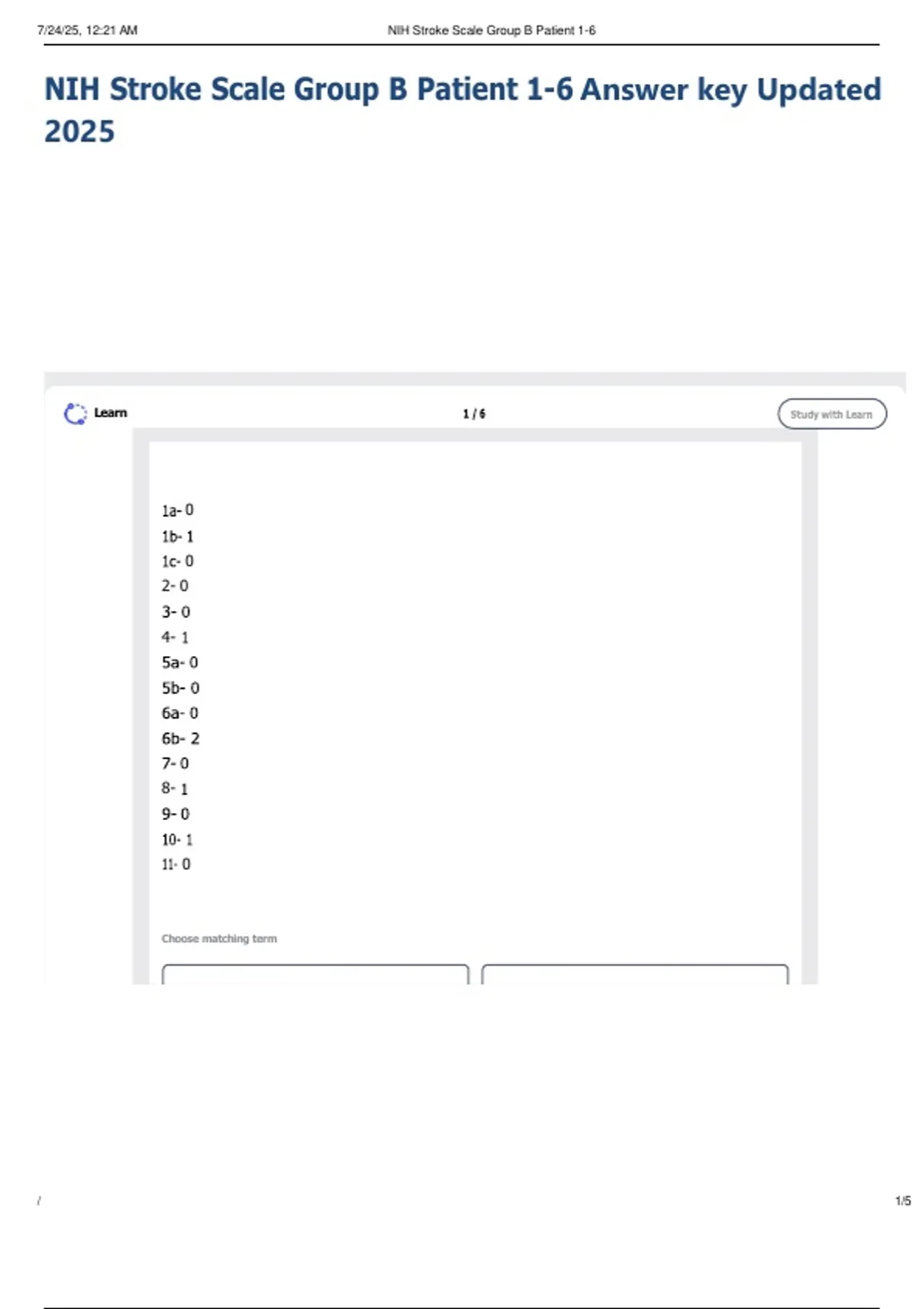 NIH Stroke Scale Group B Patient 1-6 Answer key Updated