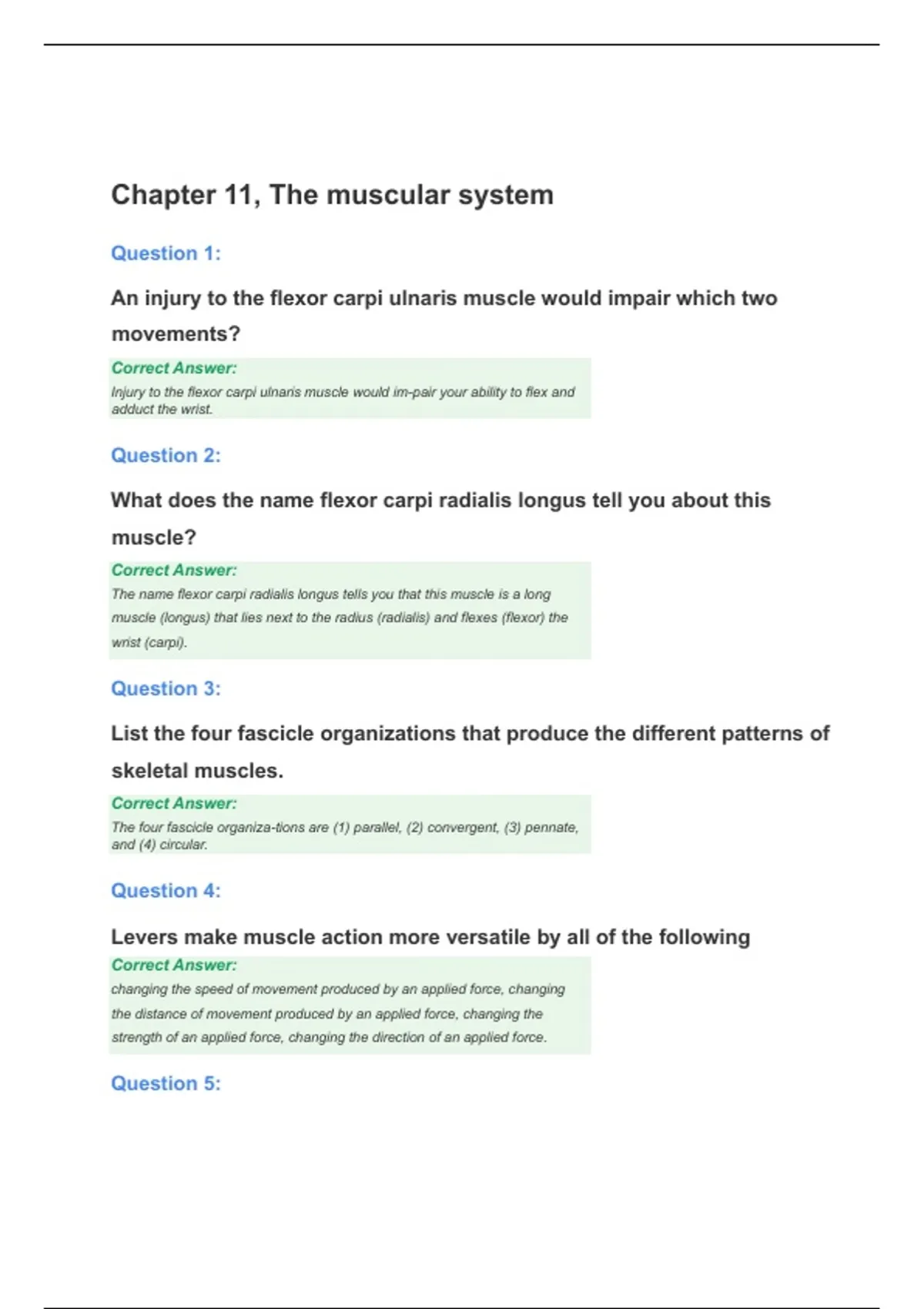 This document provides actual test questions and 100% verified answers for "Principles of Anatomy and Physiology" (15th Edition) by Gerard J. Tortora and Bryan H. Derrickson. It specifically focuses on Chapters 11 through 20, covering key topics such as the muscular system, nervous system, special senses, endocrine system, and the cardiovascular system. This comprehensive resource is updated for 2025/2026, making it an invaluable tool for exam preparation and a deeper understanding of these critical biological systems.