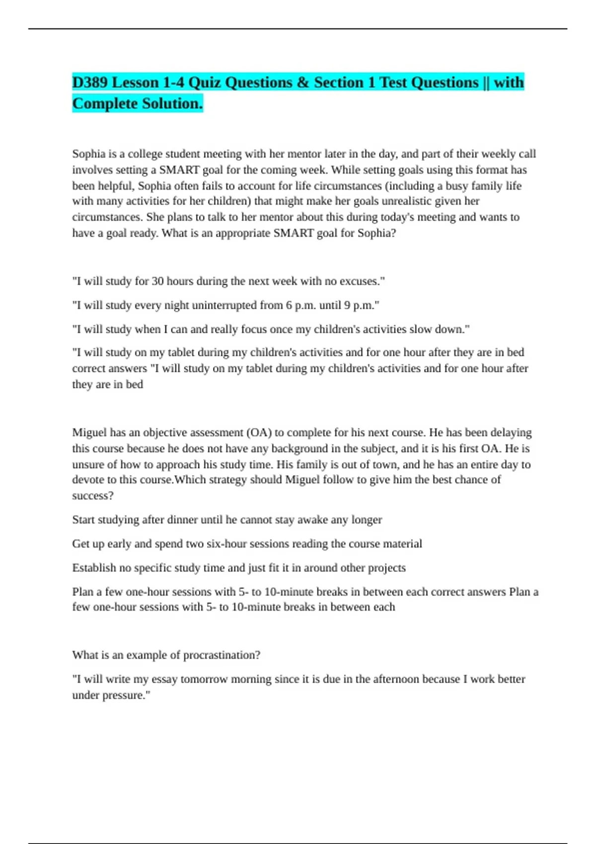 Miguel has an objective assessment (OA) to complete for his next course. He has been delaying