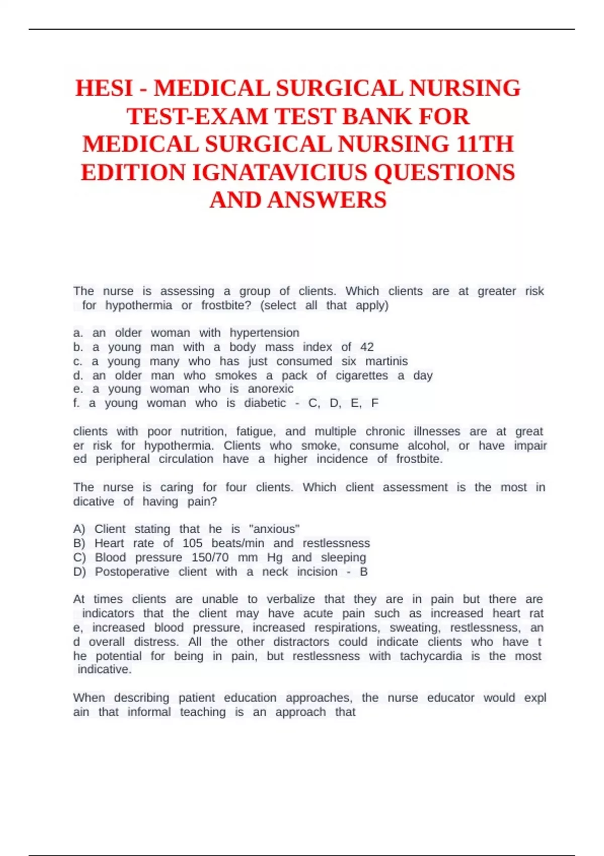 HESI - MEDICAL SURGICAL NURSING TEST-EXAM TEST BANK FOR MEDICAL SURGICAL NURSING 11TH EDITION IGNATAVICIUS QUESTIONS AND ANSWERS