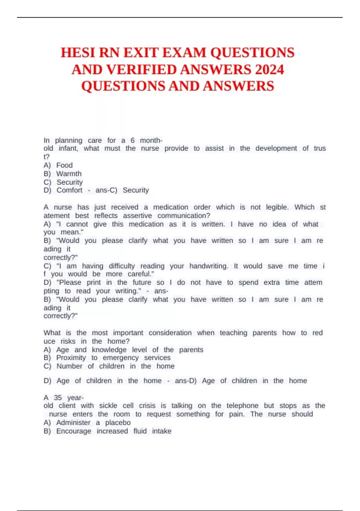 HESI RN EXIT EXAM QUESTIONS AND VERIFIED ANSWERS 2024 QUESTIONS AND ANSWERS