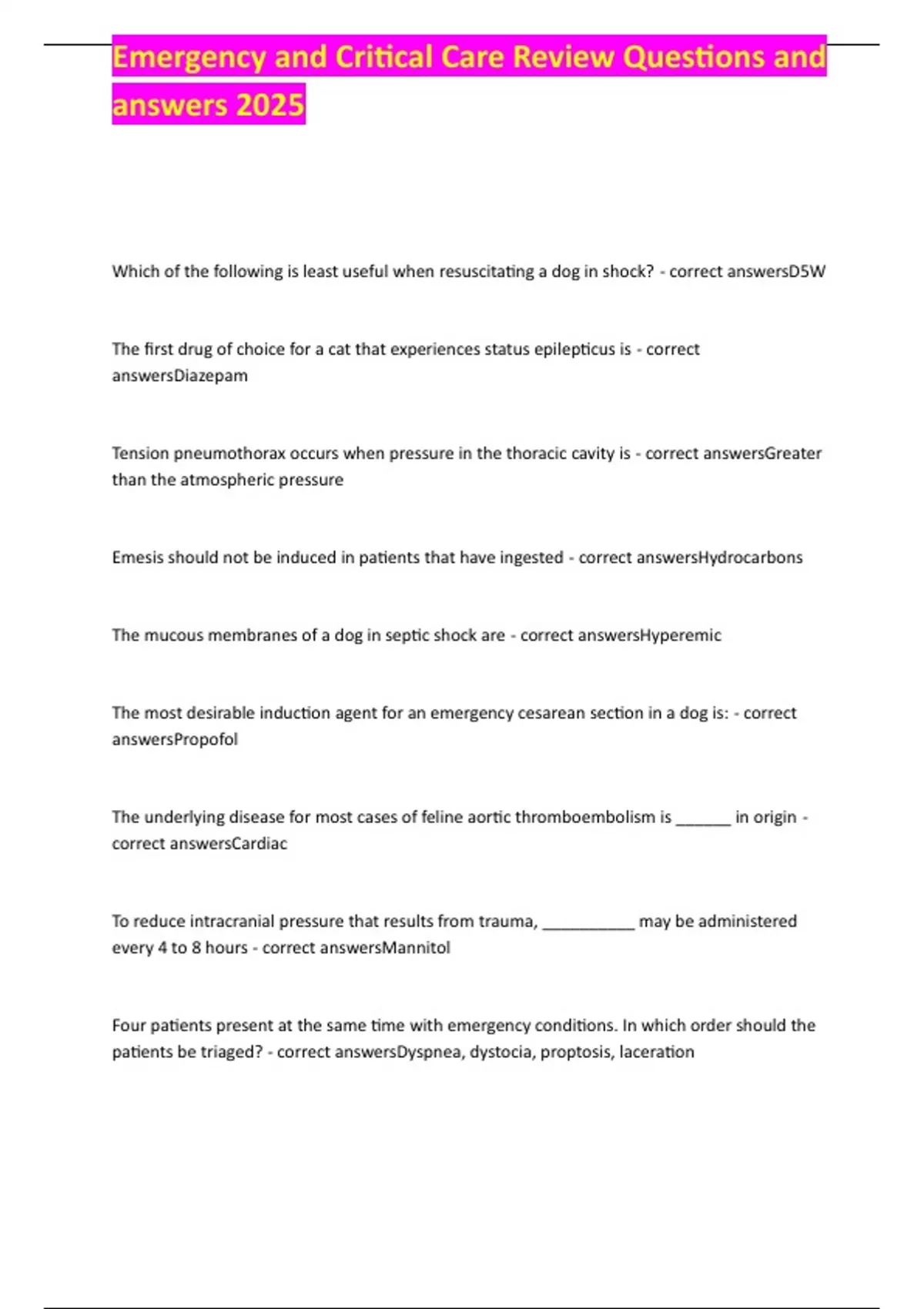 Which of the following is least useful when resuscitating a dog in shock? - correct answersD5W
