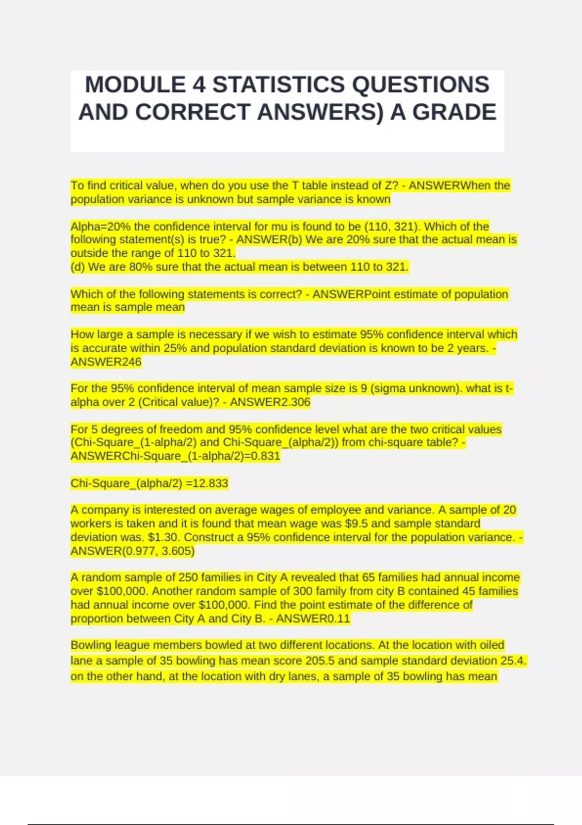 MODULE 4 STATISTICS QUESTIONS AND CORRECT ANSWERS) A GRADE