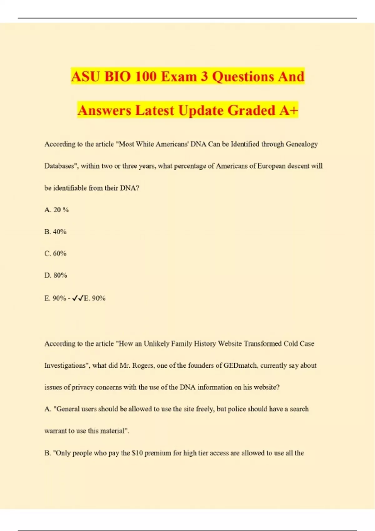 ASU BIO 100 Exam 3 Questions And Answers Latest Update Graded A+