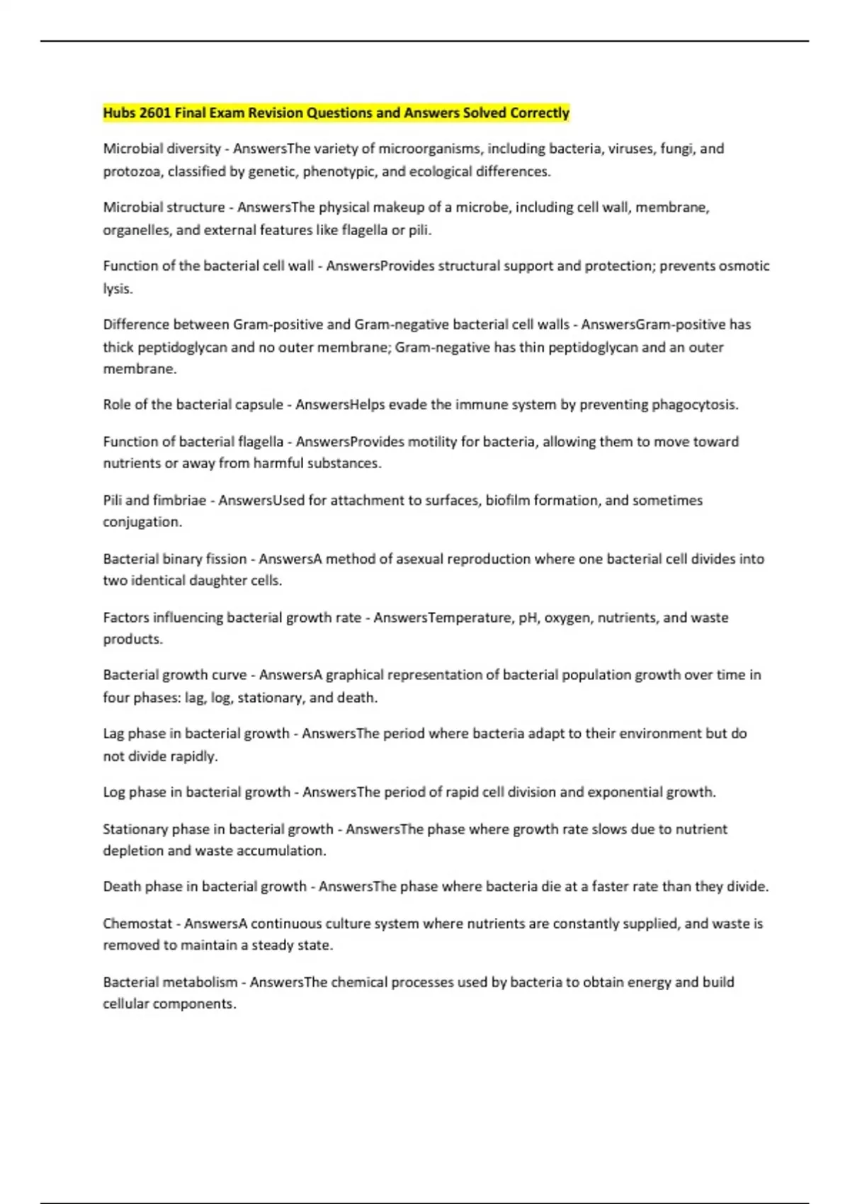 Hubs 2601 Final Exam Revision Questions and Answers Solved Correctly Microbial diversity - AnswersThe variety of microorganisms, including bacteria, viruses, fungi, and protozoa, classified by genetic, phenotypic, and ecological differences. Microbial structure - AnswersThe physical makeup of a microbe, including cell wall, membrane, organelles, and external features like flagella or pili. Function of the bacterial cell wall - AnswersProvides structural support and protection; prevents osmotic lysis. Difference between Gram-positive and Gram-negative bacterial cell walls - AnswersGram-positive has thick peptidoglycan and no outer membrane; Gram-negative has thin peptidoglycan and an outer membrane. Role of the bacterial capsule - AnswersHelps evade the immune system by preventing phagocytosis. Function of bacterial flagella - AnswersProvides motility for bacteria, allowing them to move toward nutrients or away from harmful substances. Pili and fimbriae - AnswersUsed for attachment to surfaces, biofilm formation, and sometimes conjugation. Bacterial binary fission - AnswersA method of asexual reproduction where one bacterial cell divides into two identical daughter cells. Factors influencing bacterial growth rate - AnswersTemperature, pH, oxygen, nutrients, and waste products. Bacterial growth curve - AnswersA graphical representation of bacterial population growth over time in four phases: lag, log, stationary, and death. Lag phase in bacterial growth - AnswersThe period where bacteria adapt to their environment but do not divide rapidly. Log phase in bacterial growth - AnswersThe period of rapid cell division and exponential growth. Stationary phase in bacterial growth - AnswersThe phase where growth rate slows due to nutrient depletion and waste accumulation. Death phase in bacterial growth - AnswersThe phase where bacteria die at a faster rate than they divide. Chemostat - AnswersA continuous culture system where nutrients are constantly supplied, and waste is removed to maintain a steady state. Bacterial metabolism - AnswersThe chemical processes used by bacteria to obtain energy and build cellular components. Difference between aerobic and anaerobic respiration in bacteria - AnswersAerobic uses oxygen as the final electron acceptor; anaerobic uses other molecules like nitrate or sulfate. Fermentation - AnswersAn anaerobic process where bacteria convert sugars into energy without an electron transport chain. Auxotrophs - AnswersBacteria that require specific nutrients for growth that they cannot synthesize themselves. Operon - AnswersA cluster of genes in bacteria that are regulated together under a single promoter. Horizontal gene transfer - AnswersThe movement of genetic material between bacteria, not inherited from parent cells. Transformation in bacteria - AnswersUptake of free DNA from the environment by bacteria. Transduction in bacteria - AnswersTransfer of DNA from one bacterium to another via bacteriophages (viruses). Conjugation in bacteria - AnswersTransfer of DNA between bacteria through direct cell-to-cell contact, often via pili.