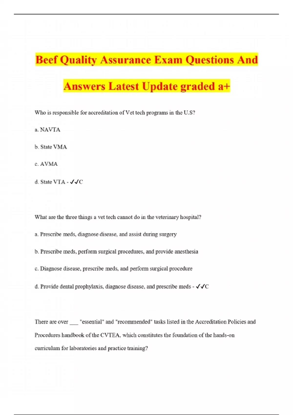 Beef Quality Assurance Exam Questions And Answers Latest Update graded a+