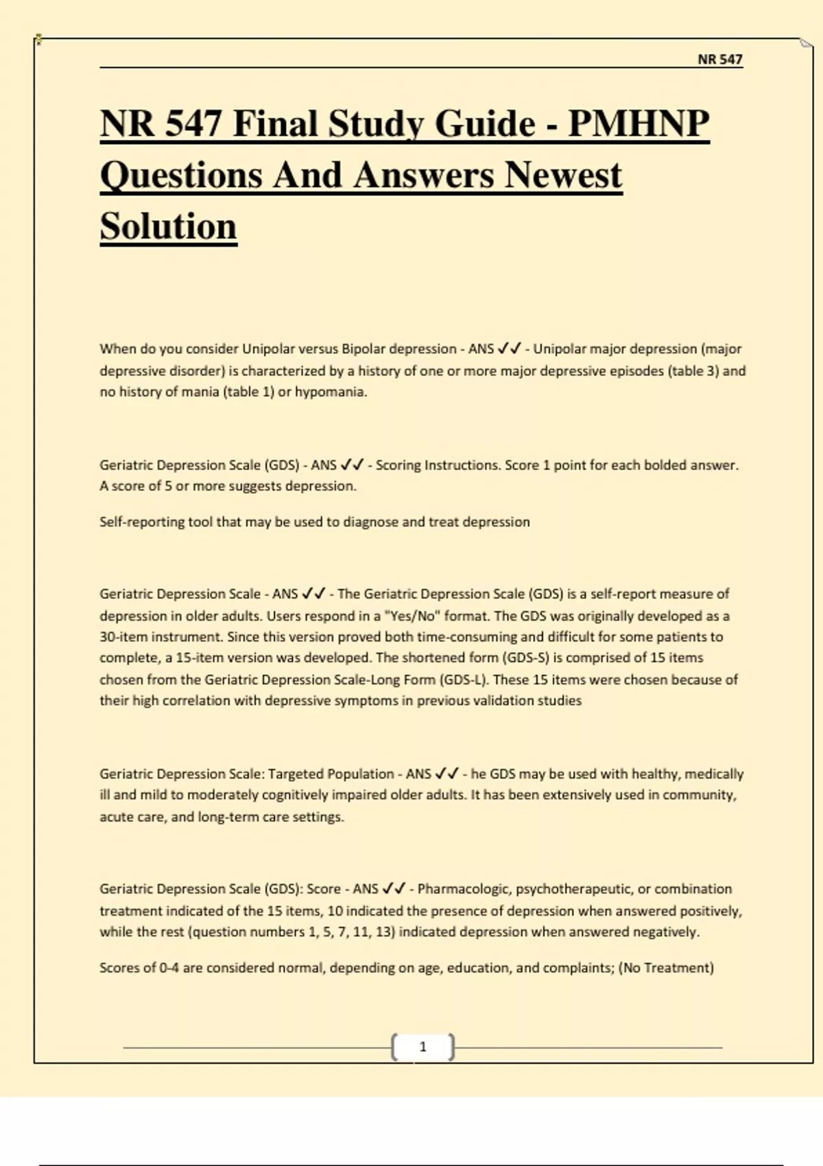 When do you consider Unipolar versus Bipolar depression - ANS - Unipolar major depression (major depressive disorder) is characterized by a history of one or more major depressive episodes (table 3) and no history of mania (table 1) or hypomania. Geriatric Depression Scale (GDS) - ANS - Scoring Instructions. Score 1 point for each bolded answer. A score of 5 or more suggests depression. Self-reporting tool that may be used to diagnose and treat depression Geriatric Depression Scale - ANS - The Geriatric Depression Scale (GDS) is a self-report measure of depression in older adults. Users respond in a "Yes/No" format. The GDS was originally developed as a 30-item instrument. Since this version proved both time-consuming and difficult for some patients to complete, a 15-item version was developed. The shortened form (GDS-S) is comprised of 15 items chosen from the Geriatric Depression Scale-Long Form (GDS-L). These 15 items were chosen because of their high correlation with depressive symptoms in previous validation studies Geriatric Depression Scale: Targeted Population - ANS - he GDS may be used with healthy, medically ill and mild to moderately cognitively impaired older adults. It has been extensively used in community, acute care, and long-term care settings. Geriatric Depression Scale (GDS): Score - ANS - Pharmacologic, psychotherapeutic, or combination treatment indicated of the 15 items, 10 indicated the presence of depression when answered positively, while the rest (question numbers 1, 5, 7, 11, 13) indicated depression when answered negatively. Scores of 0-4 are considered normal, depending on age, education, and complaints; (No Treatment) 5-8 indicate mild depression; (Pharmacologic or psychotherapeutic treatment may be indicated Base treatment on duration of symptoms and functional impairment 9-11 indicate moderate depression; (Pharmacologic, psychotherapeutic, or combination treatment indicated) 12-15 indicate severe depression.(Pharmacologic, psychotherapeutic, or combination treatment indicated
