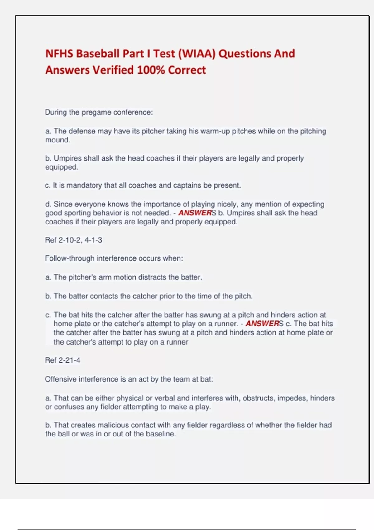 NFHS Baseball Part I Test (WIAA) Questions And Answers Verified 100% Correct During the pregame conference: a. The defense may have its pitcher taking his warm-up pitches while on the pitching mound. b. Umpires shall ask the head coaches if their players are legally and properly equipped. c. It is mandatory that all coaches and captains be present. d. Since everyone knows the importance of playing nicely, any mention of expecting good sporting behavior is not needed. - ANSWERS b. Umpires shall ask the head coaches if their players are legally and properly equipped. Ref 2-10-2, 4-1-3 Follow-through interference occurs when: a. The pitcher's arm motion distracts the batter. b. The batter contacts the catcher prior to the time of the pitch. c. The bat hits the catcher after the batter has swung at a pitch and hinders action at home plate or the catcher's attempt to play on a runner. - ANSWERS c. The bat hits the catcher after the batter has swung at a pitch and hinders action at home plate or the catcher's attempt to play on a runner Ref 2-21-4 Offensive interference is an act by the team at bat: a. That can be either physical or verbal and interferes with, obstructs, impedes, hinders or confuses any fielder attempting to make a play. b. That creates malicious contact with any fielder regardless of whether the fielder had the ball or was in or out of the baseline. c. When a coach physically assists a runner during playing action. d. A and B. - ANSWERS d. A and B. Ref 2-21-1 The term "ball" is used as: a. A playing implement necessary to conduct a game. b. A designation of a pitch that is not touched by the bat. c. A way of describing a pitch that is not a strike. d. All of the above. - ANSWERS d. All of the above Ref 2-4-1 To "intentionally" give a batter a base on balls: a. The pitcher must throw four pitches out of the strike zone. b. The catcher or coach must request to award the batter first base before the first pitch to the batter. c. The catcher or coach must request to award the batter first base on any ball-and- strike count. d. Both B and C. - ANSWERS C. The catcher or coach must request to award the batter first base on any ball-and-strike count. Ref 2-4-3 With R2 on second base, B3 swings and misses the pitch for strike two. His followthrough hits F2 while he is attempting to throw out R2, who successfully steals third base. a. There is no interference, the play stands. b. This is follow-through interference; R2 is declared out. c. This is follow-through interference; both R2 and B3 are declared out. d. This is follow-through interference, B3 is declared out and R2 is returned to second base. - ANSWERS d. This is follow-through interference, B3 is declared out and R2 is returned to second base. Ref. 2-21-4, 7-3-5c PENALTY With R3 on third base, B2 takes a practice swing that contacts the catcher's glove. The pitcher was still in the process of getting his sign from the catcher and had not started any motion to pitch. a. Time should be declared by the plate umpire. b. All players should be given the opportunity to reset in their positions. c. The batter is declared out. d. A and B - ANSWERS d. A and B Ref 2-21-5, 5-1-1n A coach may have in his possession while in a coach's box: a. Stopwatch, smart phone with scorekeeping capability, and rules book. b. Stopwatch, hard copy of a rules book and a scorebook. c. Stopwatch, tablet computer with scorekeeping capability and stored copy of rules book. d. Any object that will assist the coach in his duties. - ANSWERS b. Stopwatch, hard copy of a rules book and a scorebook. Ref 3-3-1h A defensive charged conference is held at the pitching mound with the head coach and all the infielders. The conference is considered to be concluded when: a. One of the players initially starts to return to his position. b. The coach leaves the area of the pitching mound. c. The coach crosses the foul line. d. The coach provides instructions to the outfield. - ANSWERS c. The coach crosses the foul line.
