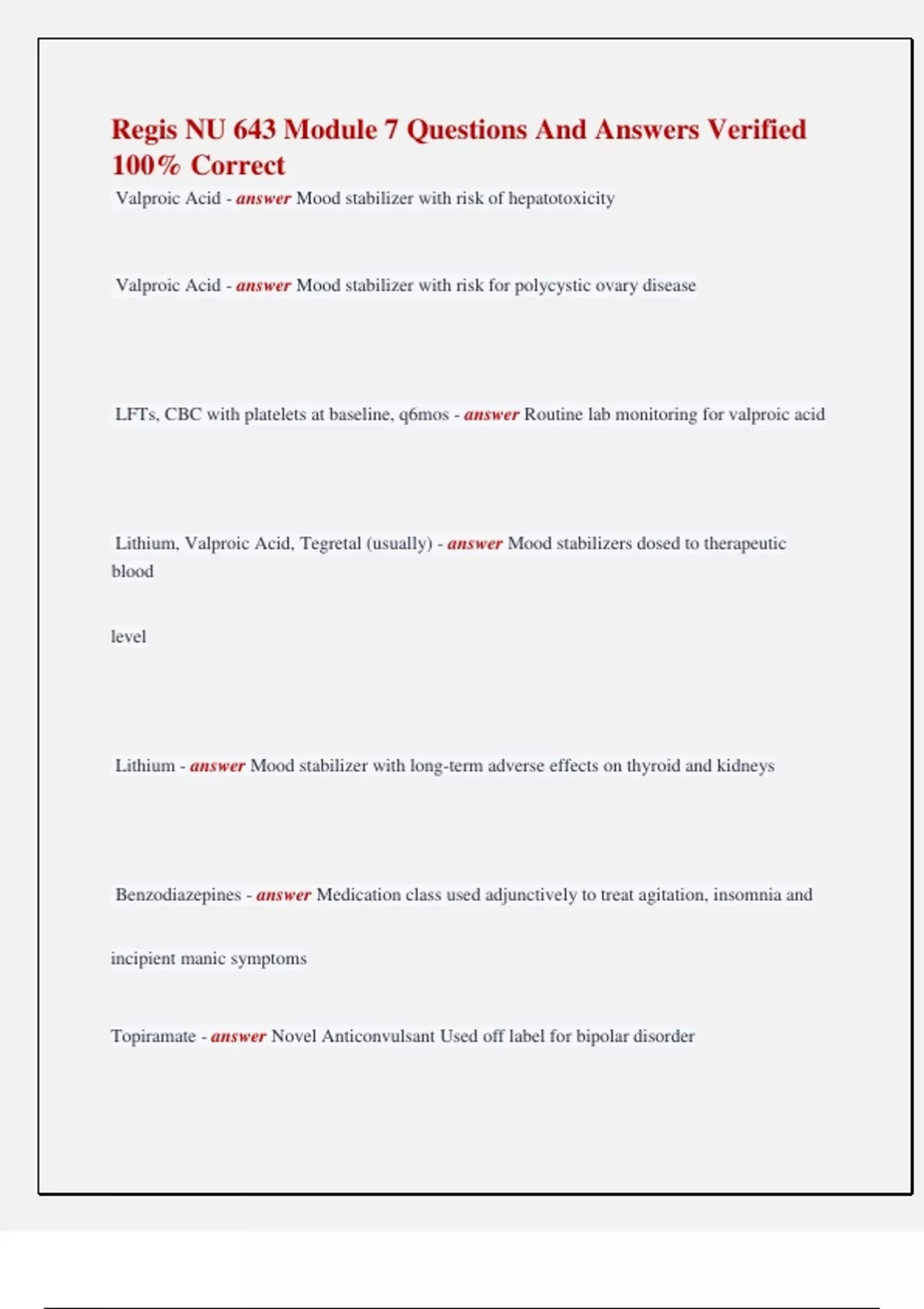 Regis NU 643 Module 7 Questions And Answers Verified 100% Correct Valproic Acid - answer Mood stabilizer with risk of hepatotoxicity Valproic Acid - answer Mood stabilizer with risk for polycystic ovary disease LFTs, CBC with platelets at baseline, q6mos - answer Routine lab monitoring for valproic acid Lithium, Valproic Acid, Tegretal (usually) - answer Mood stabilizers dosed to therapeutic blood level Lithium - answer Mood stabilizer with long-term adverse effects on thyroid and kidneys Benzodiazepines - answer Medication class used adjunctively to treat agitation, insomnia and incipient manic symptoms Topiramate - answer Novel Anticonvulsant Used off label for bipolar disorder Topiramate - answer Anticonvulsant with dose related cognitive side effects Symbyax, quetiapine, latuda - answer Medications FDA approved for treatment of bipolar depression Abilify, Lithium, Lamictal - answer Non FDA approved options for treatment of bipolar depression Suicide Risk - answer FDA Black box warning on anticonvulsants DRESS - multi organ hypersensitivity reaction syndrome - answer Adverse side effect characterized by rare occurrence of rash, fever, lymphadenopathy Carbamazepine - answer Mood stabilizer with potential for significant drug-drug interactions Carbamazepine - answer Mood stabilizer that carries risk of hematologic abnormalities