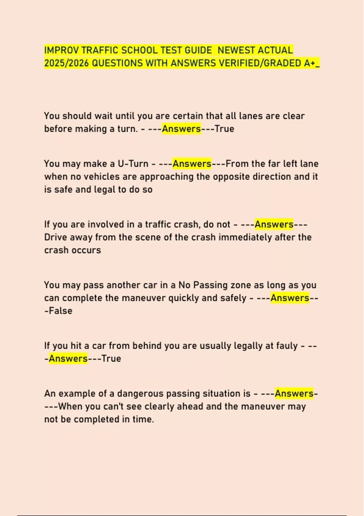 IMPROV TRAFFIC SCHOOL TEST GUIDE NEWEST ACTUAL 2025/2026 QUESTIONS WITH ANSWERS VERIFIED/GRADED A+_