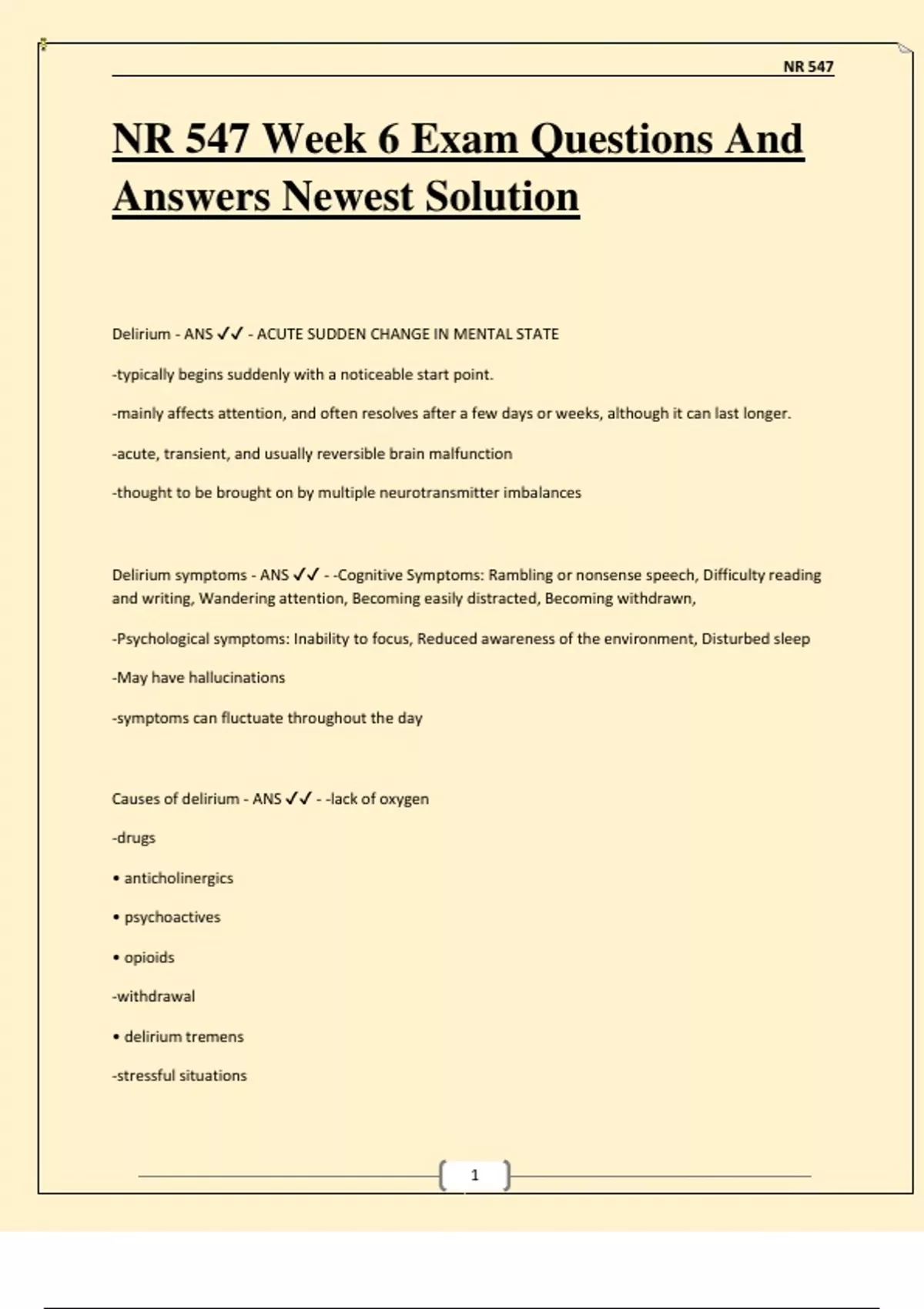 Delirium - ANS ✔✔ - ACUTE SUDDEN CHANGE IN MENTAL STATE