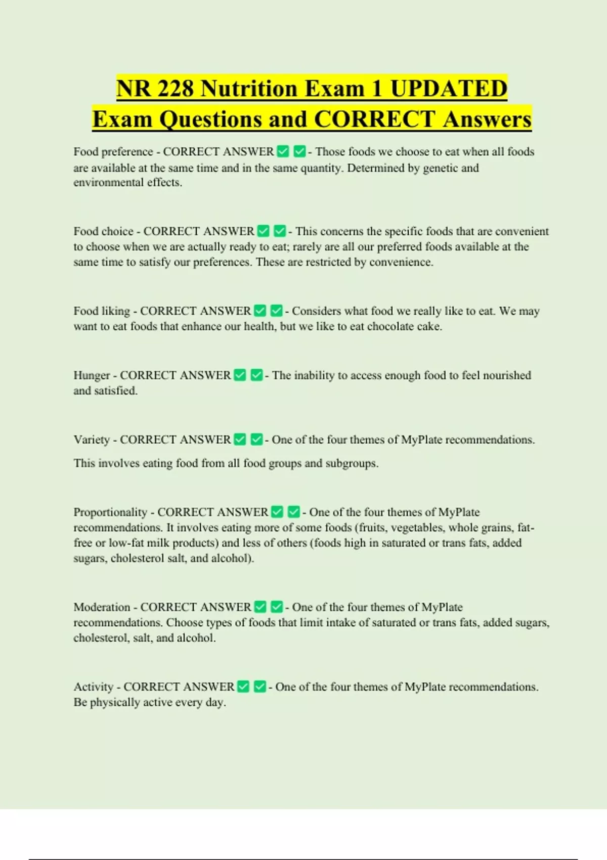 NR 228 Nutrition Exam 1 UPDATED Exam Questions and CORRECT Answers Food preference - CORRECT ANSWER - Those foods we choose to eat when all foods are available at the same time and in the same quantity. Determined by genetic and environmental effects. Food choice - CORRECT ANSWER - This concerns the specific foods that are convenient to choose when we are actually ready to eat; rarely are all our preferred foods available at the same time to satisfy our preferences. These are restricted by convenience.
