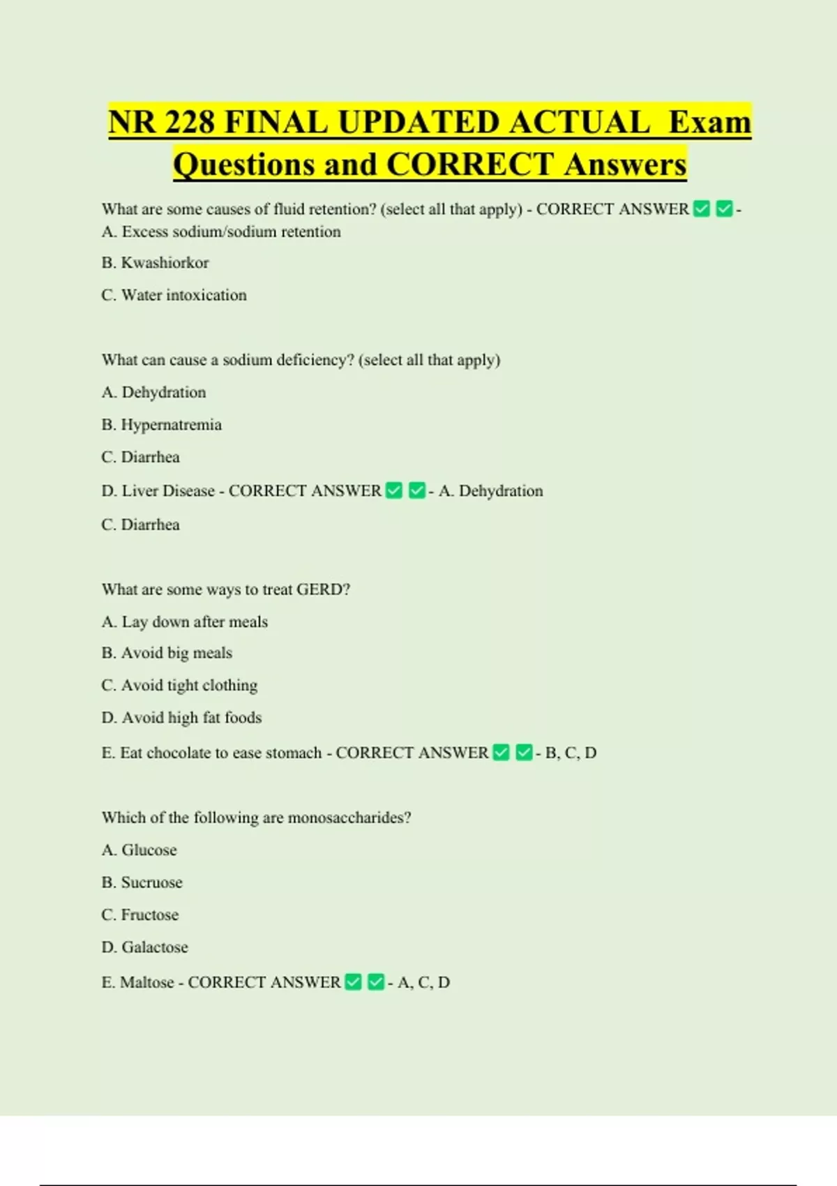 NR 228 FINAL UPDATED ACTUAL Exam Questions and CORRECT Answers What are some causes of fluid retention? (select all that apply) - CORRECT ANSWER A. Excess sodium/sodium retention B. Kwashiorkor C. Water intoxication What can cause a sodium deficiency? (select all that apply)