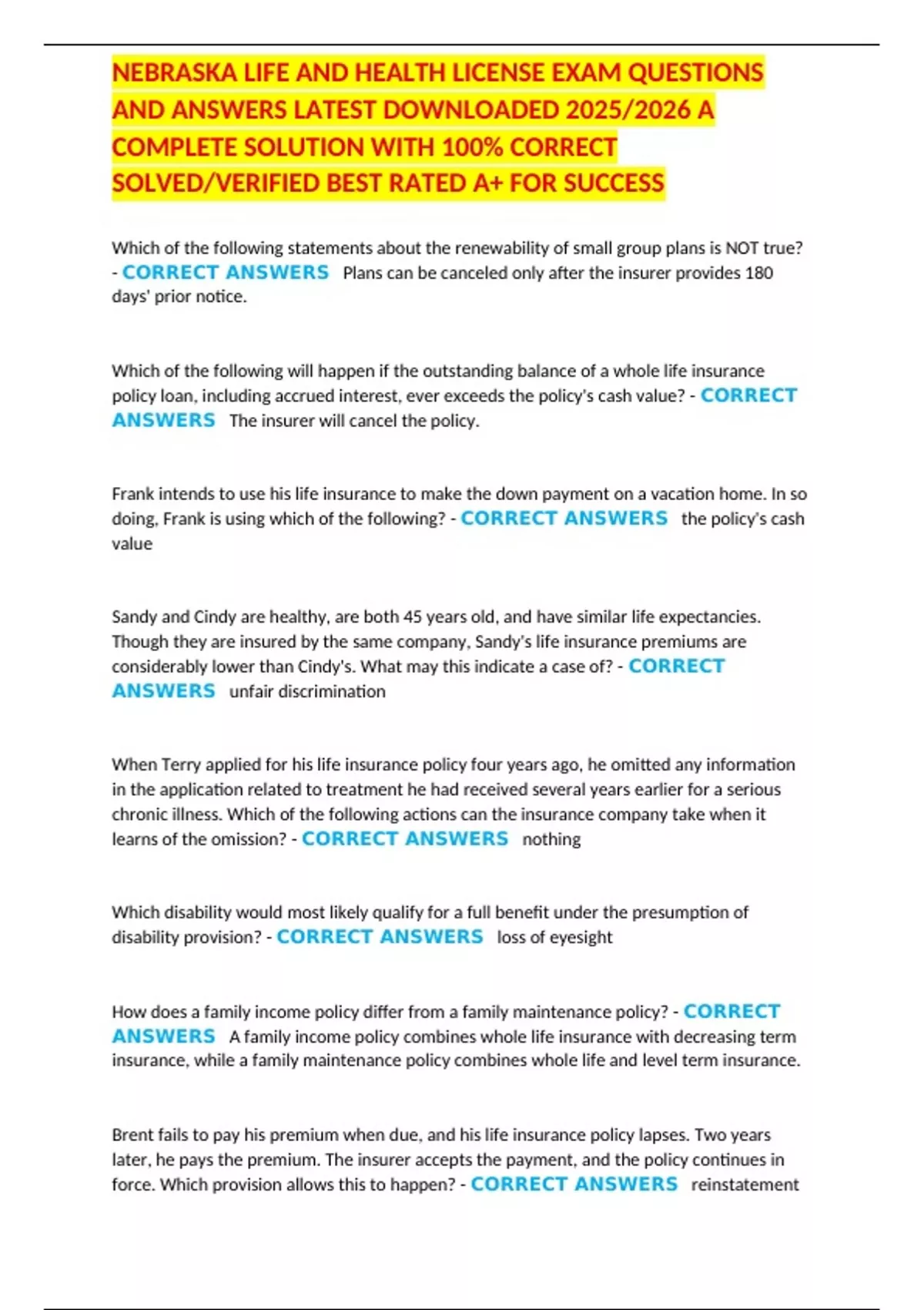 NEBRASKA LIFE AND HEALTH LICENSE EXAM QUESTIONS AND ANSWERS LATEST DOWNLOADED 2025/2026 A COMPLETE SOLUTION WITH 100% CORRECT SOLVED/VERIFIED BEST RATED A+ FOR SUCCESS