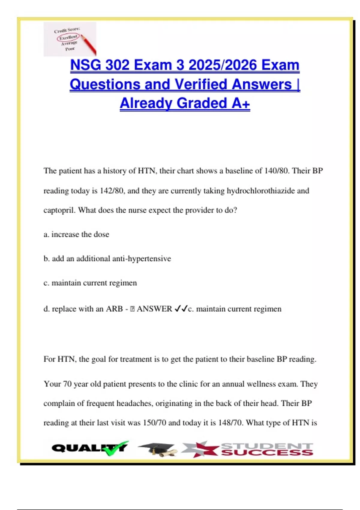 This NSG 302 Exam 3 document provides 130+ exam-verified and graded A+ questions and answers for the 2025/2026 academic year. It focuses on high-priority nursing topics such as hypertension management, heart failure types (systolic/diastolic), echocardiography, BNP interpretation, and detailed coverage of EKG readings (PAC, PVC, heart blocks). Includes cardiovascular emergencies (hypertensive crisis, shockable rhythms), endocarditis (acute/subacute, vegetations, risk factors), peripheral artery disease (PAD), stroke prevention, and medications like digoxin, amiodarone, and anticoagulants. Designed for BSN, RN, NCLEX, med-surg, and cardiovascular-focused nursing students. Keywords: hypertension stages, isolated systolic HTN, lifestyle modification, cardiac output, left-sided heart failure, right-sided heart failure, pleural effusion, BNP levels, echocardiogram, digoxin toxicity, spironolactone, EKG interpretation, PVC, PAC, heart blocks, AV block, LVAD nursing care, endocarditis, vegetations, Roth spots, splinter hemorrhages, PAD, ischemic rest pain, angioplasty, critical limb ischemia, amiodarone, warfarin, stroke prevention, DASH diet, syncope, atrial fibrillation