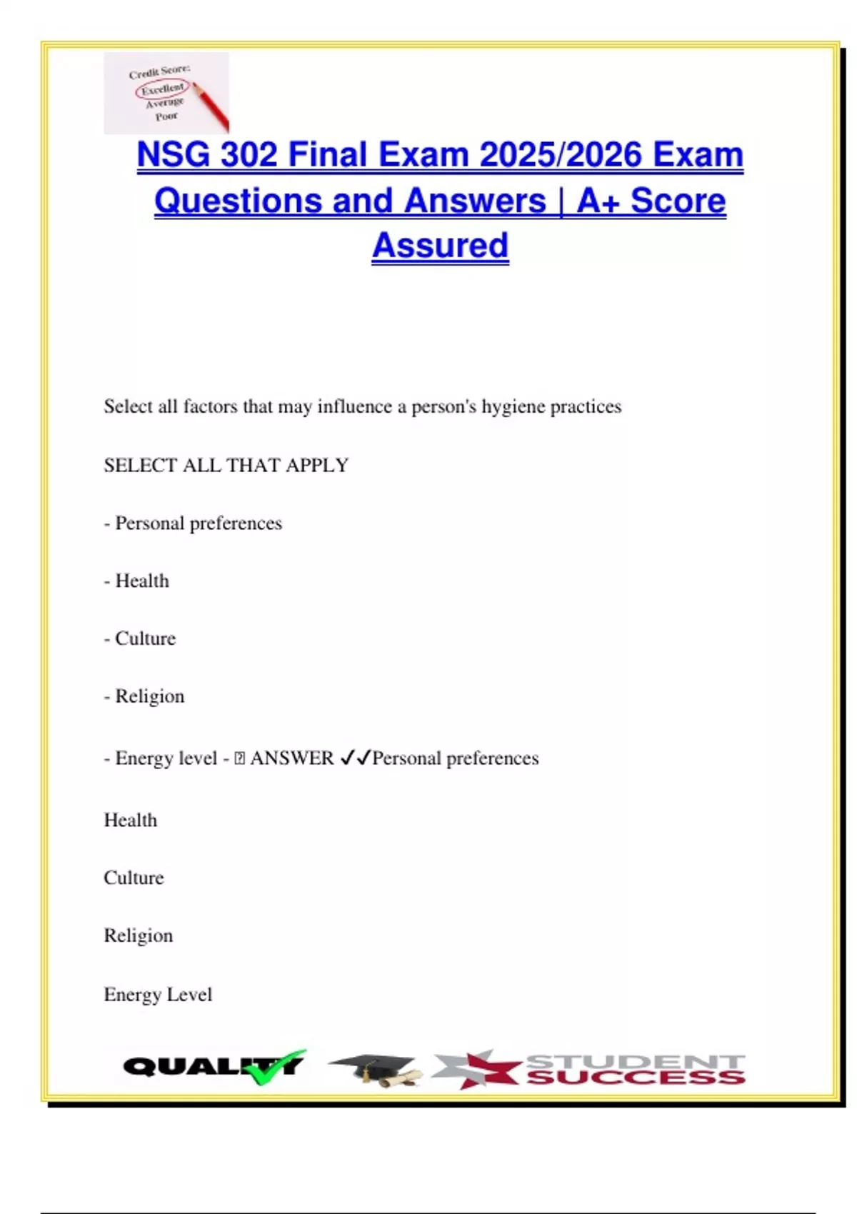 This comprehensive NSG 302 Final Exam guide includes over 150 fully verified and graded A+ questions and answers for the 2025/2026 academic year. Topics span across cardiovascular (heart failure, stroke types, perfusion), respiratory (oxygen therapy, ABGs), renal (AKI, CKD, dialysis), wound care (pressure injuries, infection), hematology, and fluid/electrolyte balance. It also emphasizes safety, nursing prioritization, emergency interventions, and medication effects (digoxin, diuretics, anticoagulants). Highly recommended for BSN, RN, LPN, and NCLEX-prep students in adult health, fundamentals, and critical care nursing courses. Keywords: heart failure, stroke symptoms, ischemic stroke, hemorrhagic stroke, oxygen delivery, ABG interpretation, fluid overload, AKI, CKD, dialysis care, wound care, pressure injury stages, skin assessment, hemodynamic monitoring, digoxin, diuretics, anticoagulants, warfarin, heparin, PT/INR, safety interventions, fall precautions, infection control, vital signs, nursing priorities