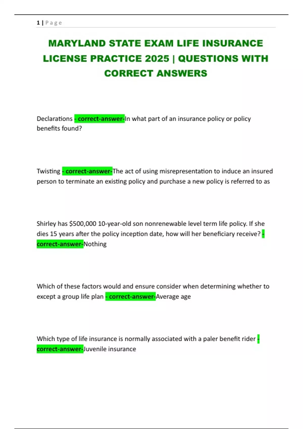 MARYLAND STATE EXAM LIFE INSURANCE