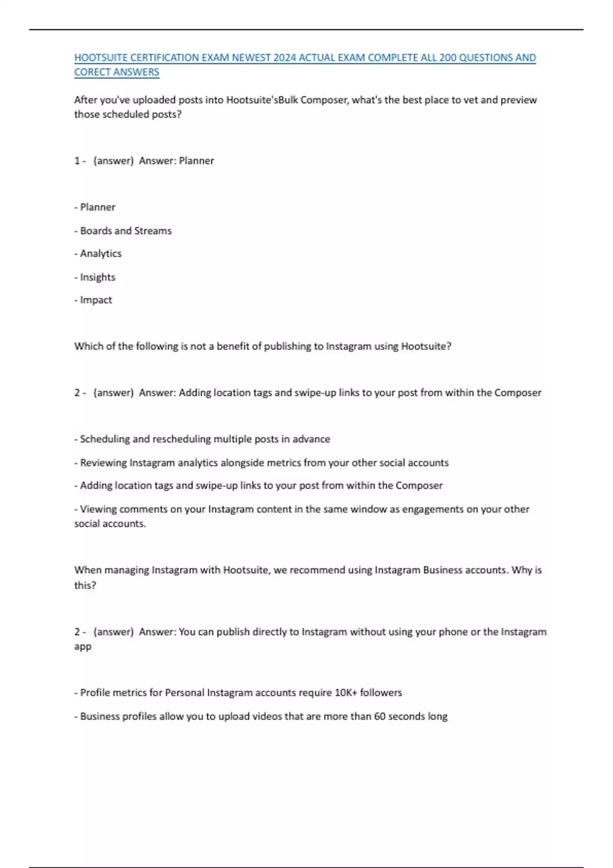 HOOTSUITE CERTIFICATION EXAM NEWEST 2024 ACTUAL EXAM COMPLETE ALL 200 QUESTIONS AND CORECT ANSWERS