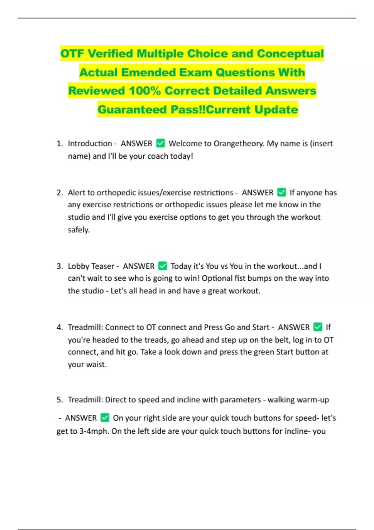 OTF Verified Multiple Choice and Conceptual Actual Emended Exam Questions With Reviewed 100% Correct Detailed Answers Guaranteed Pass!!Current Update 1. Introduction - ANSWER Welcome to Orangetheory. My name is (insert name) and I'll be your coach today! 2. Alert to orthopedic issues/exercise restrictions - ANSWER If anyone has any exercise restrictions or orthopedic issues please let me know in the studio and I'll give you exercise options to get you through the workout safely. 3. Lobby Teaser - ANSWER Today it's You vs You in the workout...and I can't wait to see who is going to win! Optional fist bumps on the way into the studio - Let's all head in and have a great workout. 4. Treadmill: Connect to OT connect and Press Go and Start - ANSWER If you're headed to the treads, go ahead and step up on the belt, log in to OT connect, and hit go. Take a look down and press the green Start button at your waist. 5. Treadmill: Direct to speed and incline with parameters - walking warm-up - ANSWER On your right side are your quick touch buttons for speed- let's get to 3-4mph. On the left side are your quick touch buttons for incline- you should be at 1%. You also have +/- buttons at your waist to adjust your speed and incline. Treads, this is your 1-minute walking warm-up.