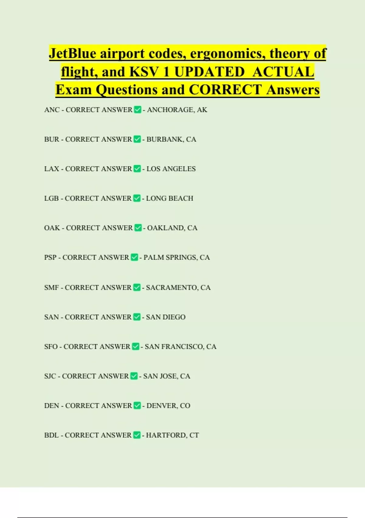 JetBlue airport codes, ergonomics, theory of flight, and KSV 1 UPDATED ACTUAL Exam Questions and CORRECT Answers ANC - CORRECT ANSWER - ANCHORAGE, AK BUR - CORRECT ANSWER - BURBANK, CA LAX - CORRECT ANSWER - LOS ANGELES LGB - CORRECT ANSWER - LONG BEA