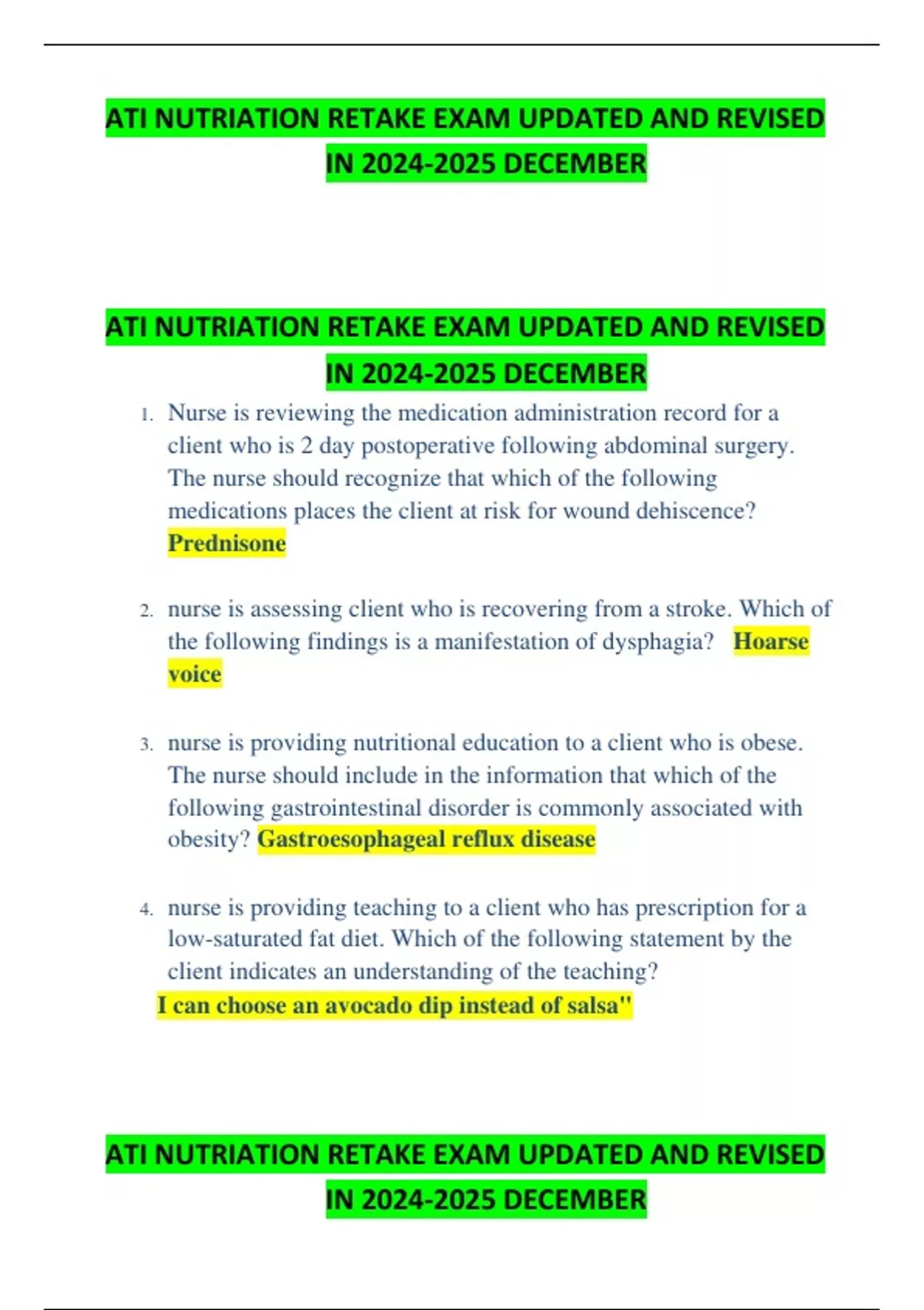 , ATI NUTRIATION RETAKE EXAM UPDATED AND REVISED