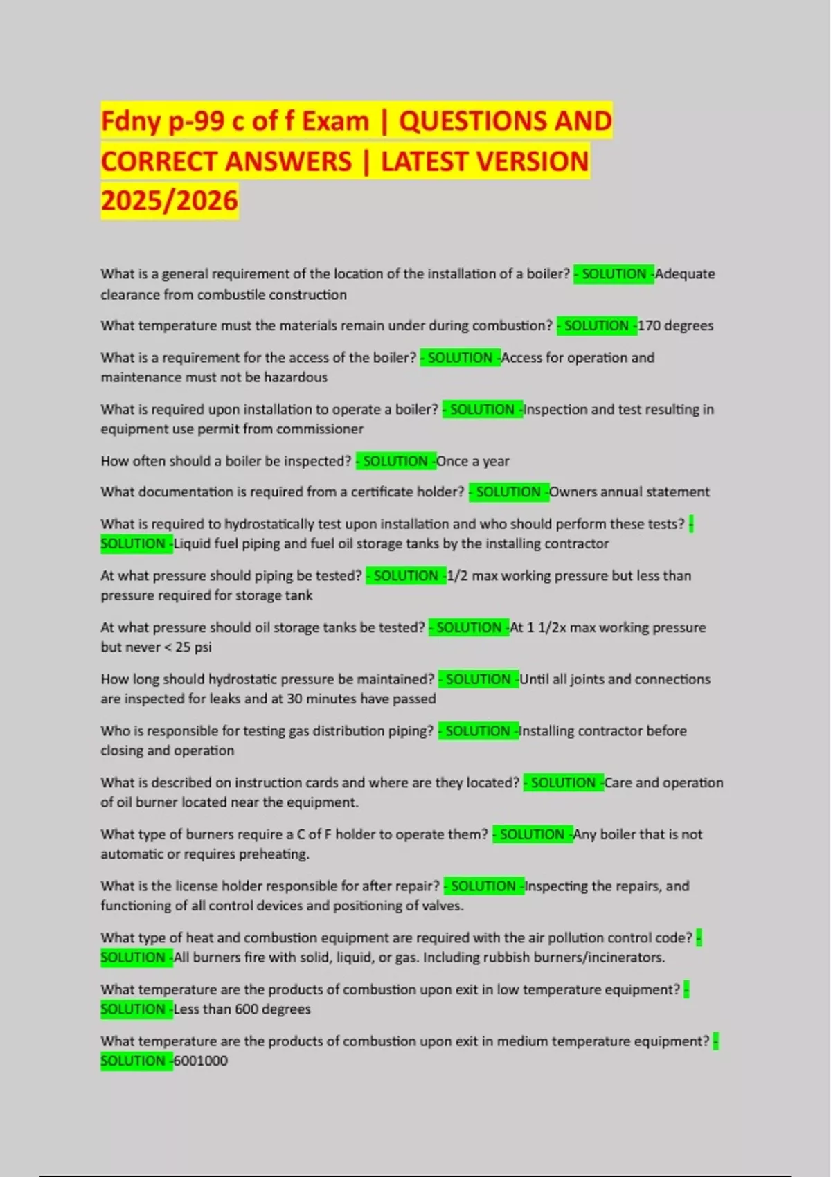 Fdny p-99 c of f Exam | QUESTIONS AND CORRECT ANSWERS | LATEST VERSION 2025/2026 What is a general requirement of the location of the installation of a boiler? - SOLUTION -Adequate clearance from combustile construction What temperature must the materials remain under during combustion? - SOLUTION -170 degrees What is a requirement for the access of the boiler? - SOLUTION -Access for operation and maintenance must not be hazardous What is required upon installation to operate a boiler? - SOLUTION -Inspection and test resulting in equipment use permit from commissioner How often should a boiler be inspected? - SOLUTION -Once a year What documentation is required from a certificate holder? - SOLUTION -Owners annual statement What is required to hydrostatically test upon installation and who should perform these tests? - SOLUTION -Liquid fuel piping and fuel oil storage tanks by the installing contractor At what pressure should piping be tested? - SOLUTION -1/2 max working pressure but less than pressure required for storage tank At what pressure should oil storage tanks be tested? - SOLUTION -At 1 1/2x max working pressure but never < 25 psi
