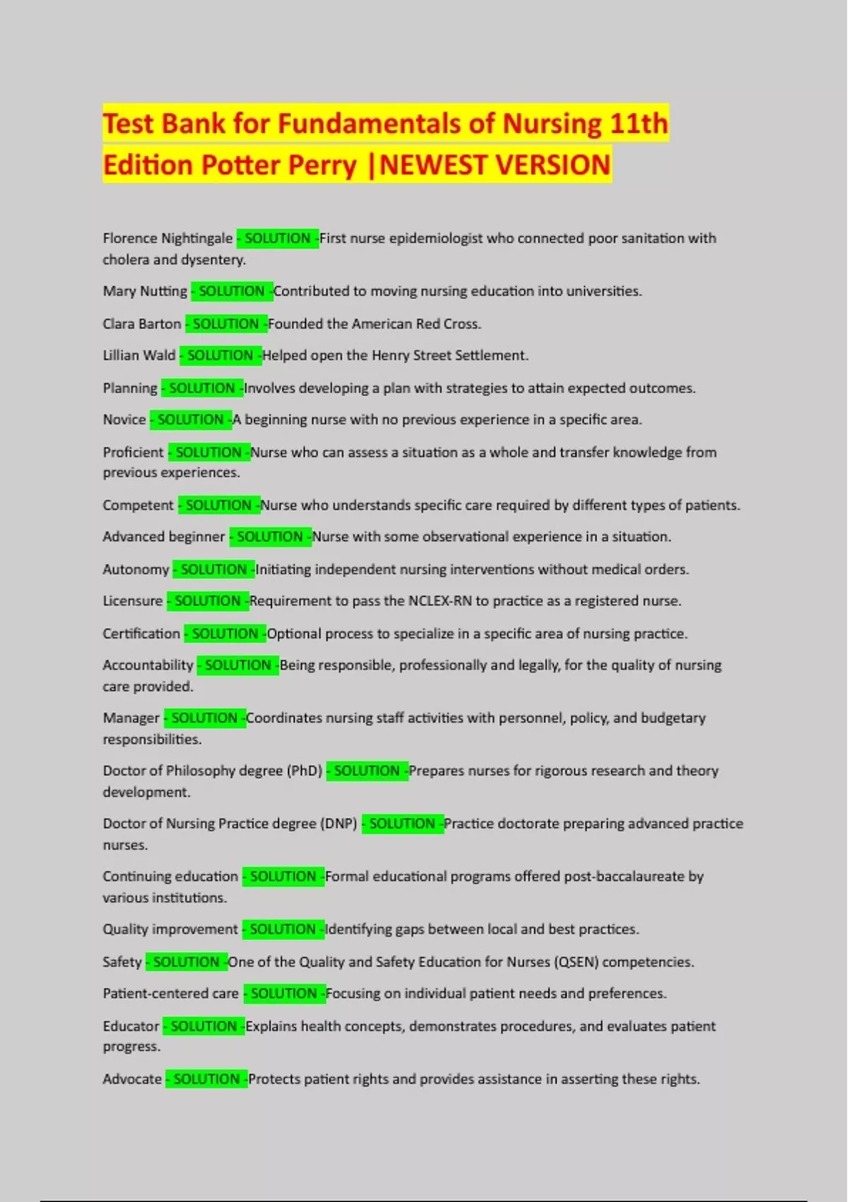Test Bank for Fundamentals of Nursing 11th Edition Potter Perry |NEWEST VERSION Florence Nightingale - SOLUTION -First nurse epidemiologist who connected poor sanitation with cholera and dysentery. Mary Nutting - SOLUTION -Contributed to moving nursing education into universities. Clara Barton - SOLUTION -Founded the American Red Cross. Lillian Wald - SOLUTION -Helped open the Henry Street Settlement. Planning - SOLUTION -Involves developing a plan with strategies to attain expected outcomes. Novice - SOLUTION -A beginning nurse with no previous experience in a specific area. Proficient - SOLUTION -Nurse who can assess a situation as a whole and transfer knowledge from