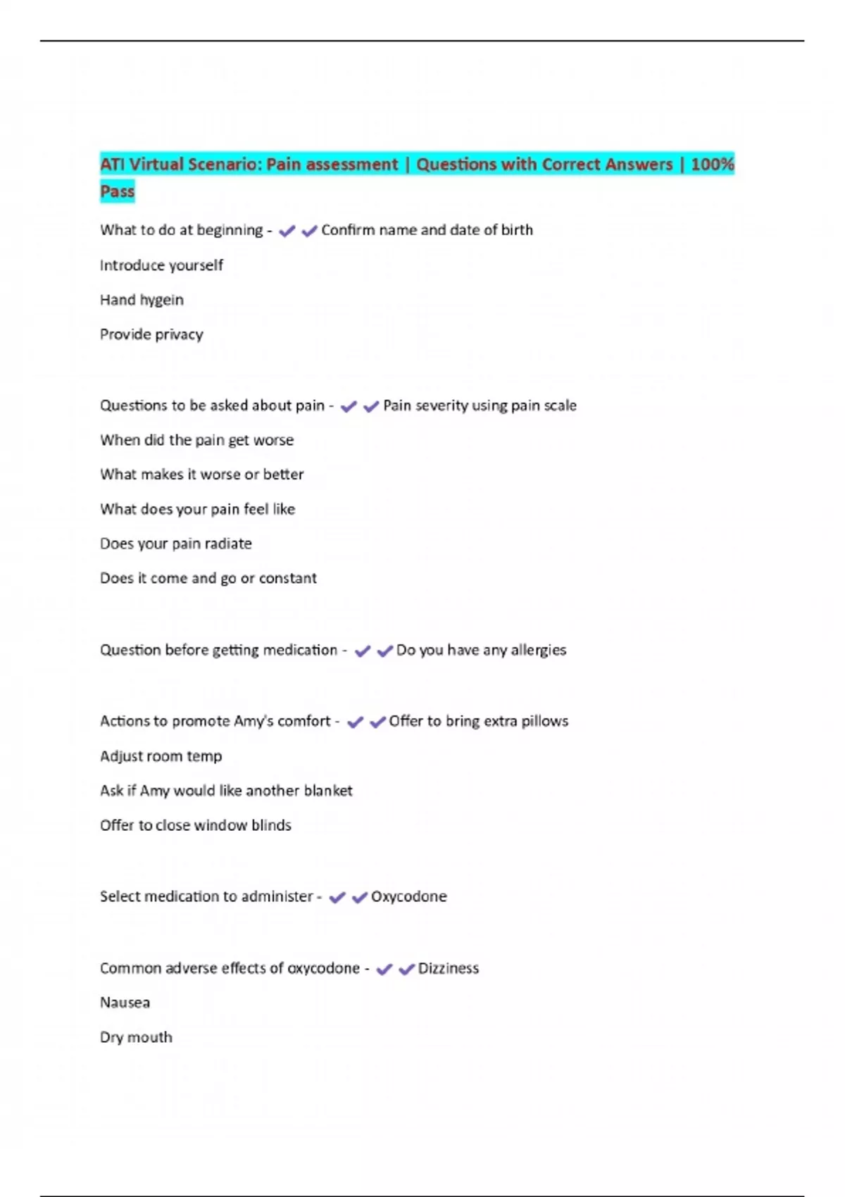 ATI Virtual Scenario: Pain assessment | Questions with Correct Answers | 100% Pass