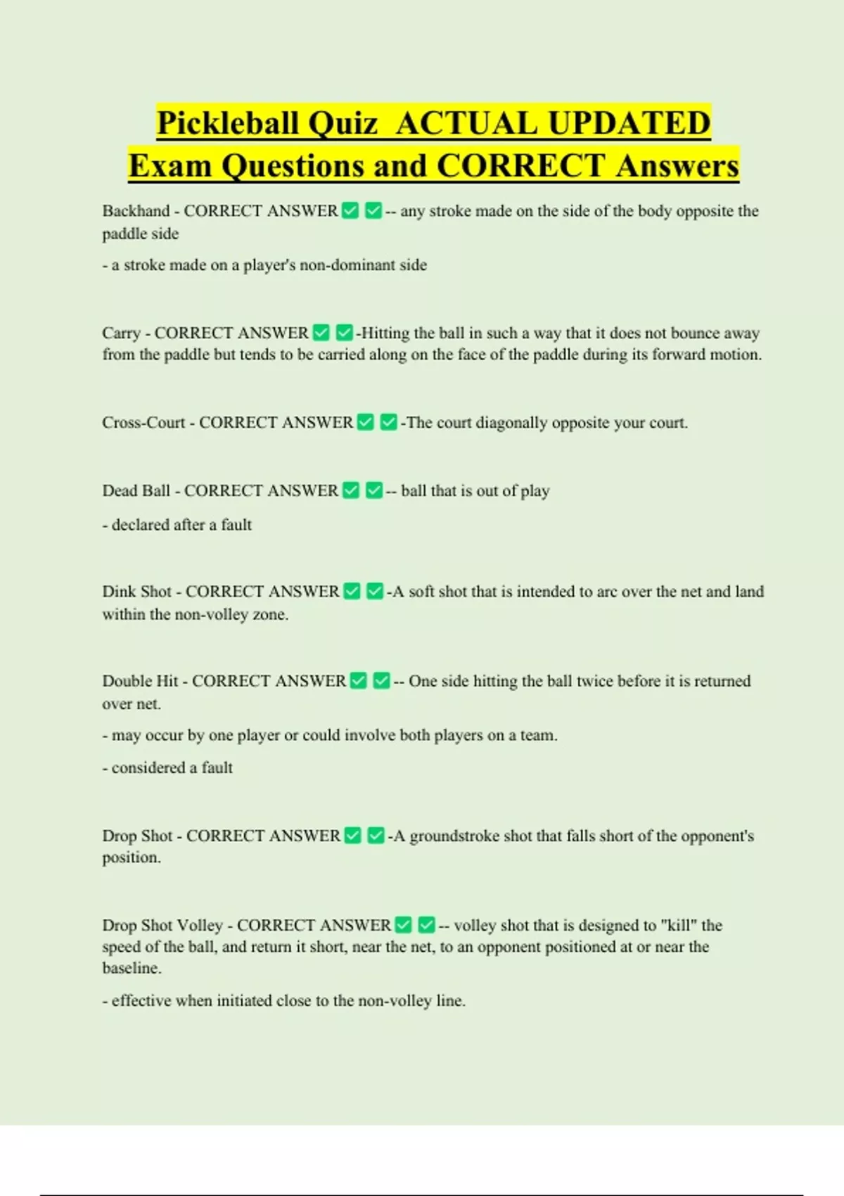 Pickleball Quiz ACTUAL UPDATED Exam Questions and CORRECT Answers