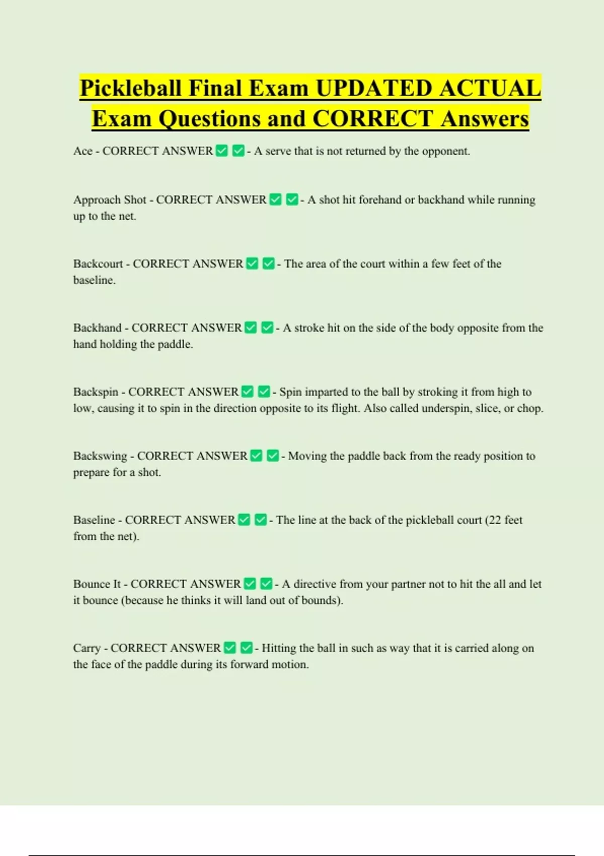Pickleball Final Exam UPDATED ACTUAL Exam Questions and CORRECT Answers Ace - CORRECT ANSWER - A serve that is not returned by the opponent. Approach Shot - CORRECT ANSWER up to the net. Backcourt - CORRECT ANSWER baseline. Backhand - CORRECT ANSWER hand holding the paddle. Backspin - CORRECT ANSWER - A shot hit forehand or backhand while running - The area of the court within a few feet of the - A stroke hit on the side of the body opposite fr