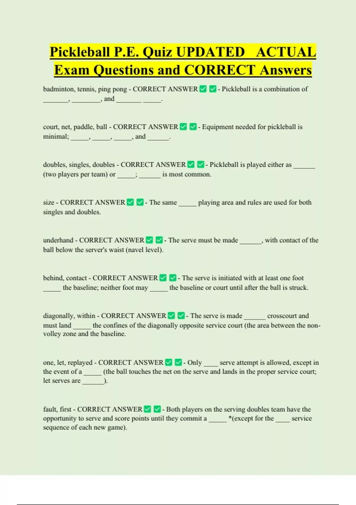 Pickleball P.E. Quiz UPDATED ACTUAL Exam Questions and CORRECT Answers