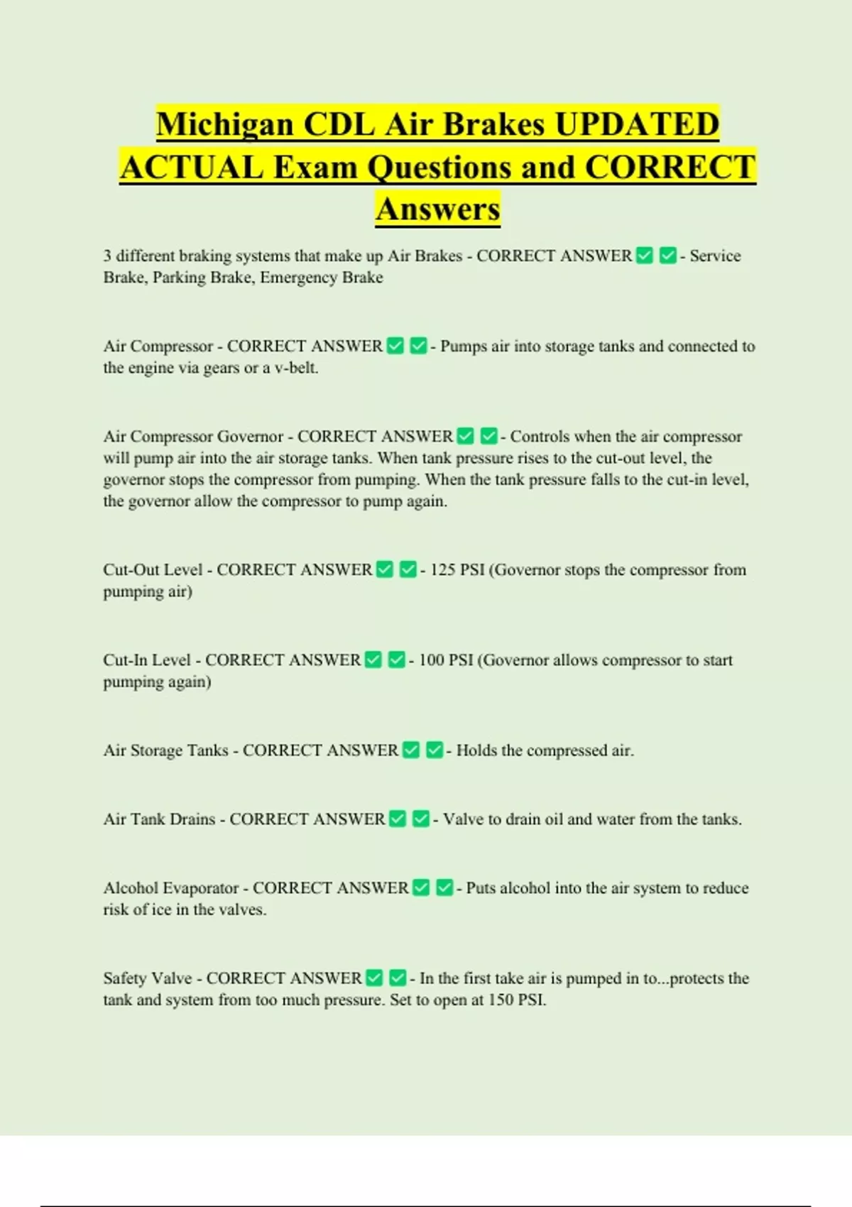 Spring Brakes - CORRECT ANSWER - Used for emergency brakes and parking brakes.