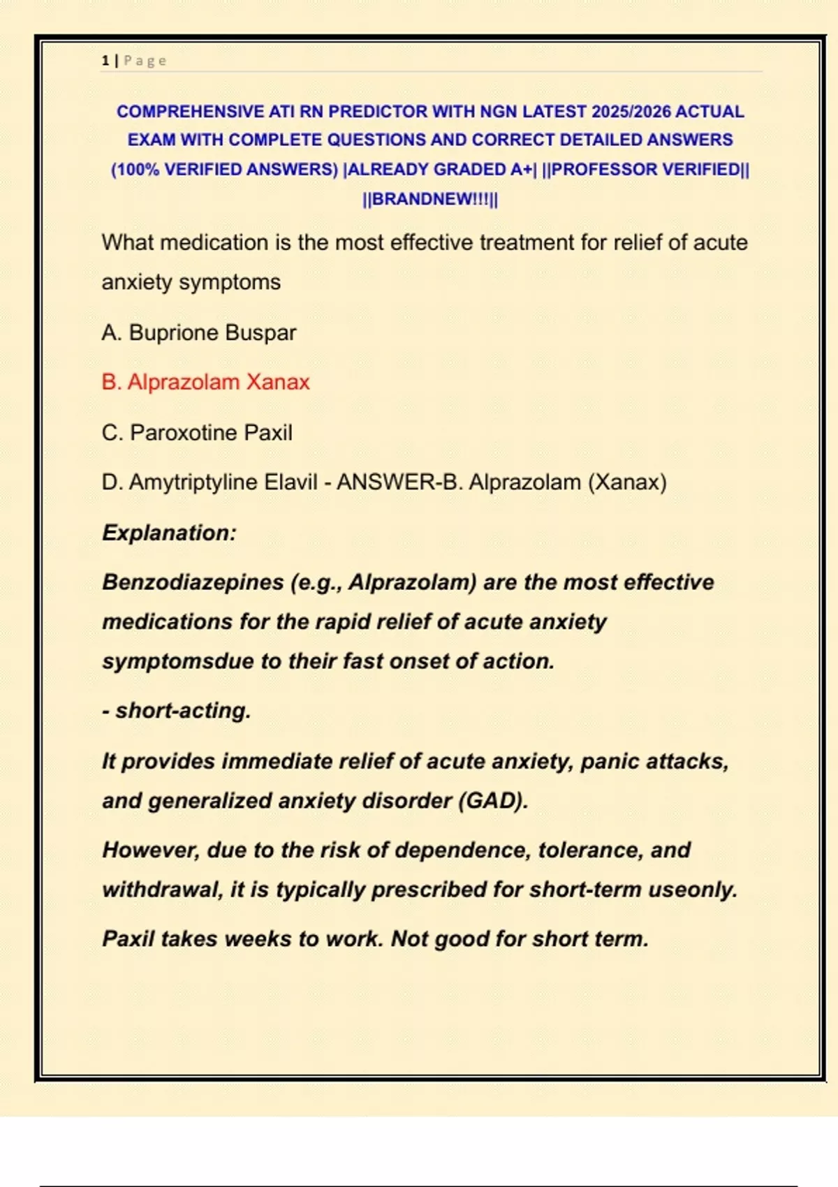 D. Amytriptyline Elavil - ANSWER-B. Alprazolam (Xanax)