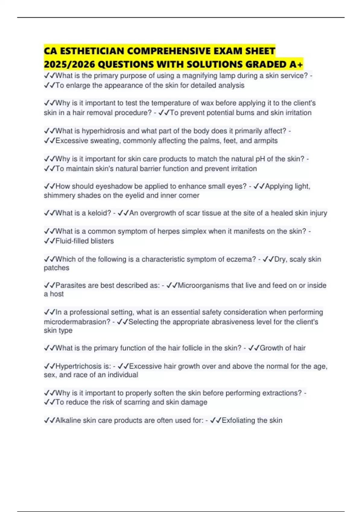 CA ESTHETICIAN COMPREHENSIVE EXAM SHEET 2025/2026 QUESTIONS WITH SOLUTIONS GRADED A+