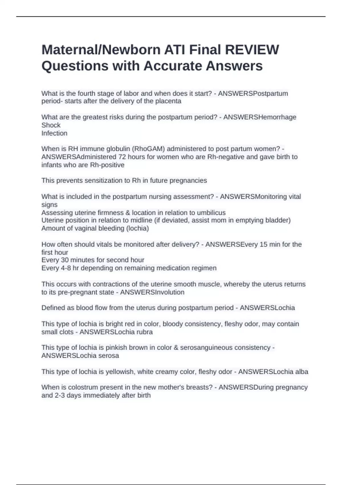 Maternal/Newborn ATI Final REVIEW Questions with Accurate Answers