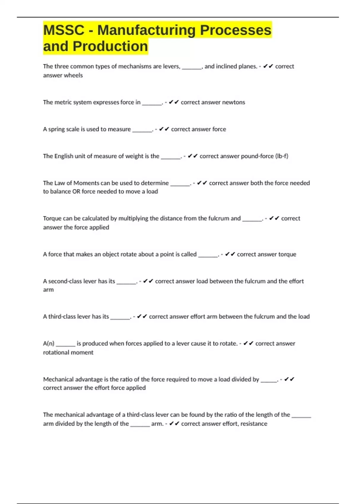A(n) ______ is produced when forces applied to a lever cause it to rotate. - ✔✔ correct answer