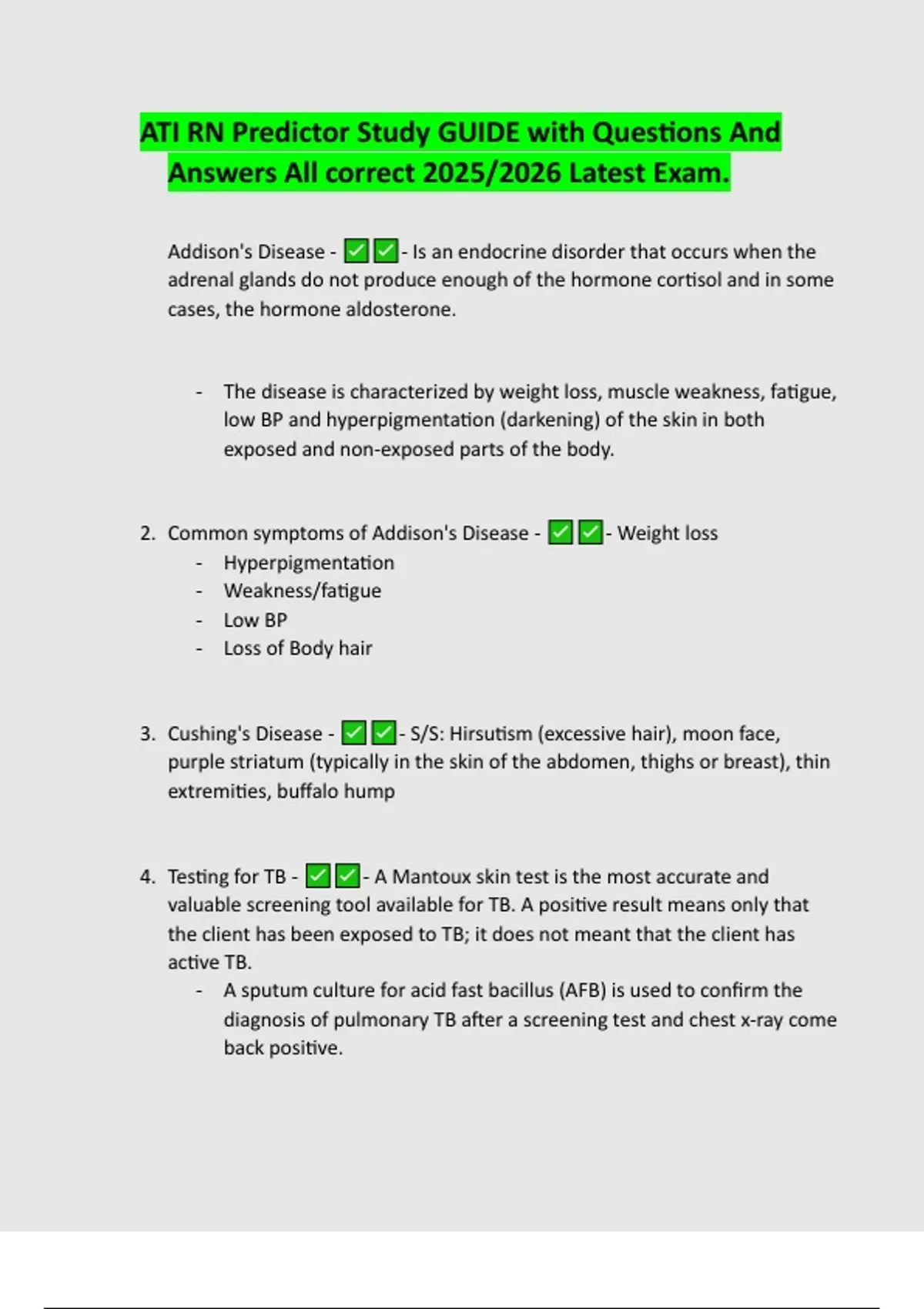 Description: This document contains the latest ATI RN Predictor Exam study guide for the 2025/2026 testing cycle, featuring a full set of verified questions with 100% correct answers. It covers all key nursing topics including pharmacology, medical-surgical nursing, maternal-newborn care, mental health, and critical thinking. Designed to reflect ATI’s real exam format, this guide is perfect for RN students seeking comprehensive and reliable preparation.