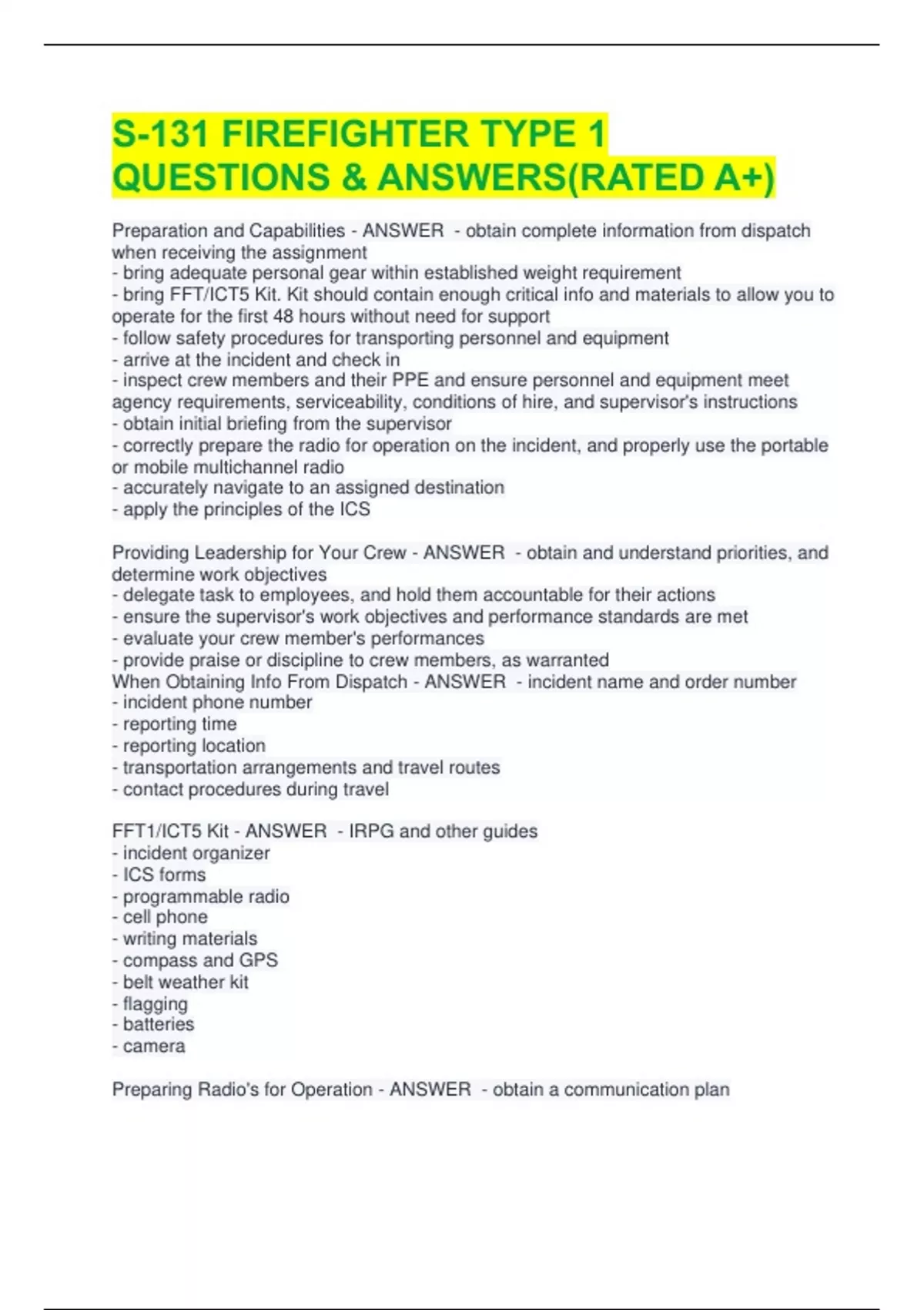 S-131 FIREFIGHTER TYPE 1 QUESTIONS & ANSWERS(RATED A+)