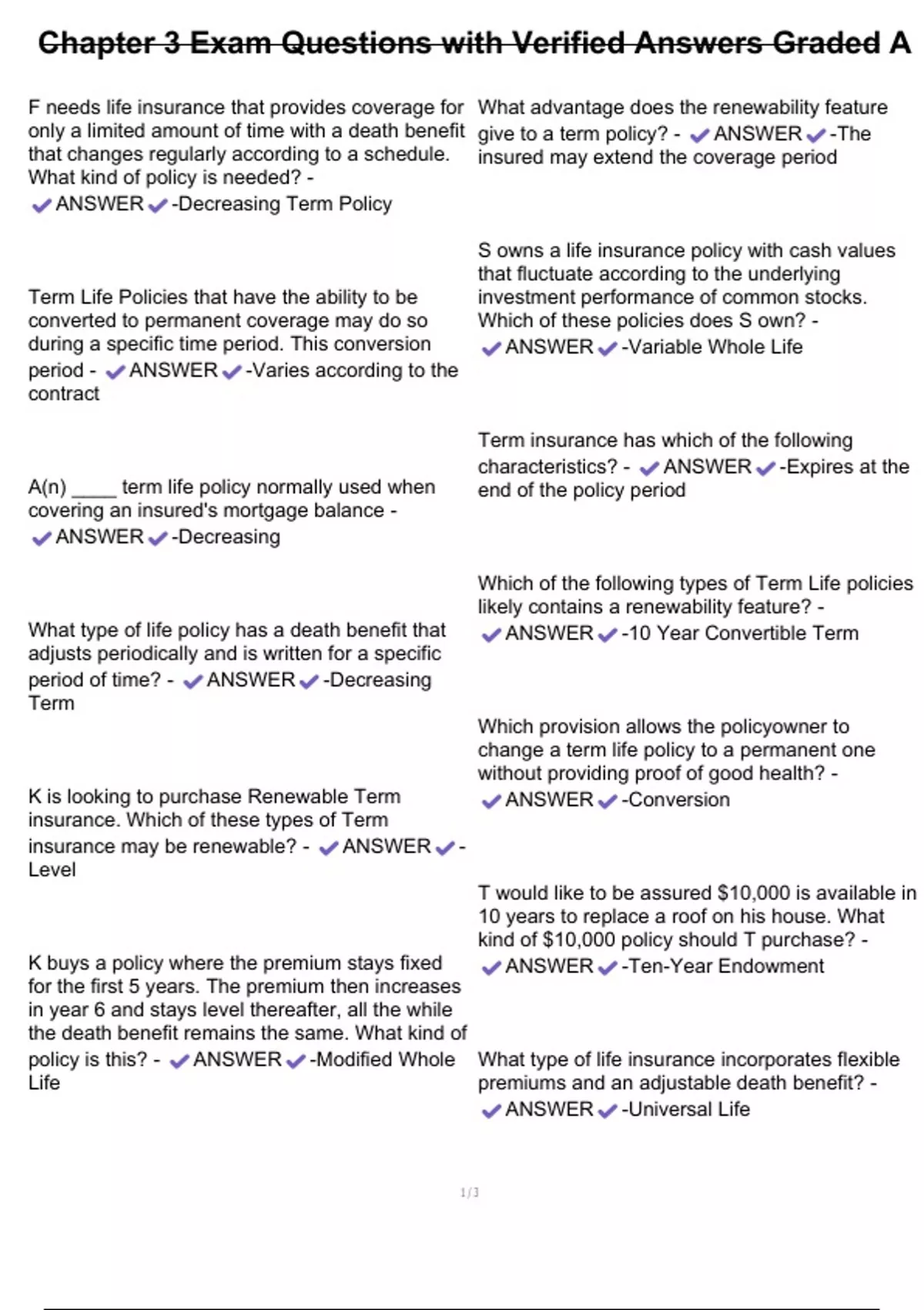 F needs life insurance that provides coverage for only a limited amount of time with a death benefit that changes regularly according to a schedule. What kind of policy is needed? - ANSWER -Decreasing Term Policy Term Life Policies that have the ability to be converted to perman