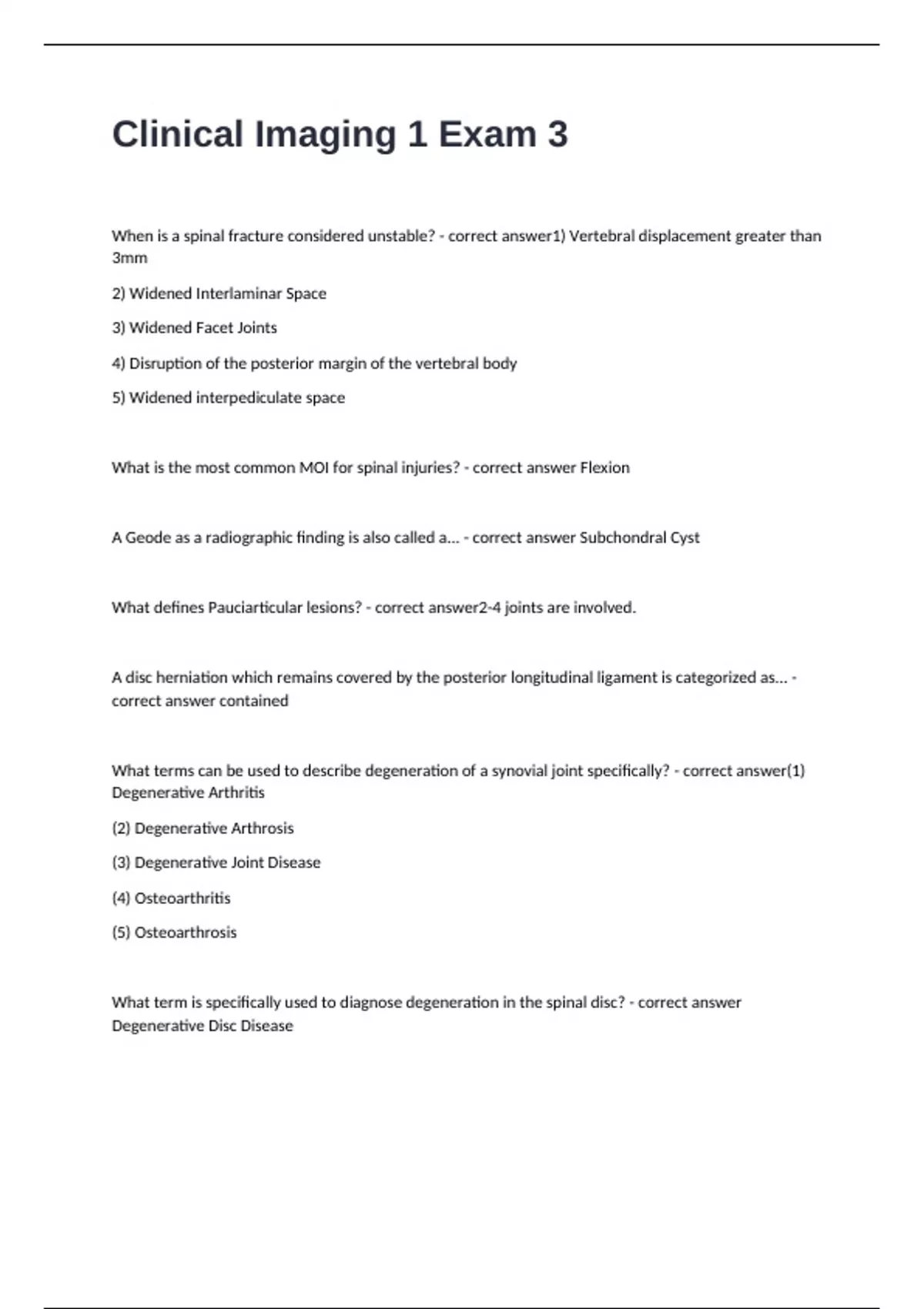 When is a spinal fracture considered unstable? - correct answer1) Vertebral displacement greater than 3mm 2) Widened Interlaminar Space 3) Widened Facet Joints 4) Disruption of the posterior margin of the vertebral body 5) Widened interpediculate space What is the most common MOI for spinal injuries? - correct answer Flexion A Geode as a radiographic finding is also called a... - correct answer Subchondral Cyst What defines Pauciarticular lesions? - correct answer2-4 joints are involved. A disc herniation which remains covered by the posterior longitudinal ligament is categorized as... - correct answer contained What terms can be used to describe degeneration of a synovial joint specifically? - correct answer(1) Degenerative Arthritis (2) Degenerative Arthrosis (3) Degenerative Joint Disease (4) Osteoarthritis (5) Osteoarthrosis What term is specifically used to diagnose degeneration in the spinal disc? - correct answer Degenerative Disc Disease What is Wilkinson's Syndrome? - correct answer Unilateral spondylosis (pars defect) with sclerosis of the opposite pedicle (most common cause of a sclerotic pedicle). Sclerosis may be due to stress hypertrophy.